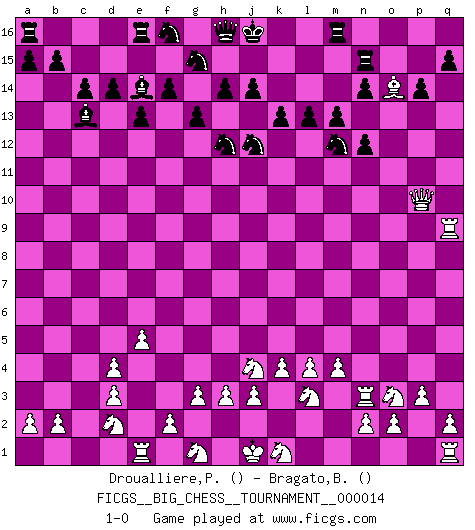Last move : 1-0 2007 October 28 21:18:29 [Event "FICGS__BIG_CHESS__TOURNAMENT__000014"] [Site "FICGS"] [Date "2007.10.23"] [Round "1"] [White "Droualliere,Philippe"] [Black "Bragato,Bruno"] [Result "1-0"] [WhiteElo ""] [BlackElo ""] 1.k2-k4 k15-k13 2.l2-l4 l15-l13 3.d2-d4 p15-p14 4.e2-e4 o16-p15 5.e4-e5 k16-l14 6.c1-k8 e15-e13 7.f1-c4 m15-m13 8.j2-l3 f16-c13 9.m2-m4 l16-o13 10.c4-d3 o13-d3 11.c2-d3 d15-d14 12.g2-g3 c16-k9 13.h1-f3 f15-f14 14.b1-d2 g16-e15 15.a1-c1 b16-d15 16.p2-p3 h15-g13 17.o1-p2 c15-c14 18.c1-c9 k9-e14 19.l1-p5 g13-j12 20.h2-j4 g15-g13 21.f3-o11 o15-o13 22.p2-h9 n15-n14 23.m1-m3 l14-m12 24.o11-p10 j15-h13 25.p1-o3 p16-o14 26.k8-o12 q16-n16 27.o12-n13 e15-f13 28.m3-n3 p15-q16 29.p5-l9 o14-n12 30.l9-o12 q16-n13 31.o12-n13 d15-f16 32.h9-e12 h13-g15 33.c9-q9 n16-n15 34.e12-j8 f13-h12 35.j8-n12 o13-n12 36.n13-o14 1-0 Follow this game move after move (download)Chess demands total concentration. (Bobby Fischer) Man braucht nicht immer den besten Zug zu spielen: Ein Zug muß aktiv, unternehmungslustig, korrekt und schön sein. (David Bronstein) Mis oponentes también hacen buenas movidas. A veces yo no tomo esas cosas en consideración. (Bobby Fischer) Toutes les manuvres exécutées sur une colonne ouverte ont pour but ultime l'intrusion définitive sur la septième ou la huitième rangée, en plein cur de la position ennemie. (Aaron Nimzovitch) The human is the only animal species whose members are able to talk themselves into difficulties that would not otherwise exist. (Wendell Johnson)