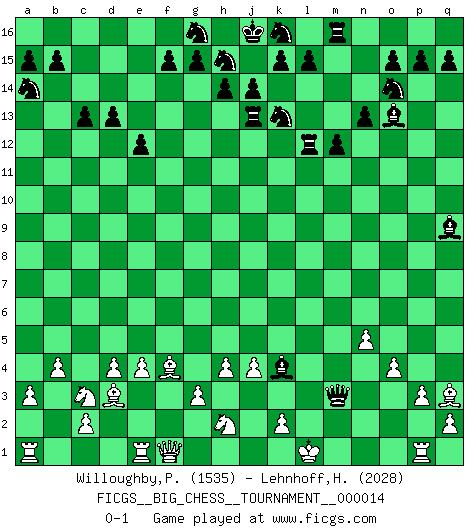 Last move : 0-1 2008 January 9 19:52:55 [Event "FICGS__BIG_CHESS__TOURNAMENT__000014"] [Site "FICGS"] [Date "2007.10.23"] [Round "1"] [White "Willoughby,Peter"] [Black "Lehnhoff,Heinz-Georg"] [Result "0-1"] [WhiteElo "1535"] [BlackElo "2028"] 1.j2-k4 m15-m13 2.d2-d4 j15-k13 3.e2-e4 h16-o10 4.p1-o3 o10-f2 5.g1-e2 f2-o10 6.h3-h4 d15-d13 7.m2-m4 e15-e13 8.g2-g3 n15-n13 9.m1-m3 l16-o13 10.e2-f4 f16-b12 11.b1-c3 e13-e12 12.n2-n4 b16-a14 13.l1-n3 e16-e13 14.o3-n5 m13-m12 15.f1-d3 e13-j13 16.f4-h5 c16-k9 17.c1-f4 o16-f8 18.p2-p3 p16-o14 19.m4-m5 m16-m14 20.m3-k3 o10-h10 21.o2-o4 c15-c13 22.a2-a3 m14-l14 23.b2-b4 a16-e16 24.n5-m3 q16-m16 25.h5-j7 k9-h7 26.h1-f1 e16-e13 27.k4-h5 e13-f13 28.j3-j4 h10-n10 29.n4-n5 h7-l4 30.k3-j3 l4-m5 31.q1-p1 l14-l2 32.m3-k4 f8-k4 33.h5-k4 b12-k4 34.j3-m3 m5-q9 35.j7-h5 n10-h5 36.o1-q3 f13-f12 37.k1-j3 h5-j6 38.j3-k5 j6-k5 39.j1-k1 k5-m3 40.n3-l1 l2-l1 41.k1-l1 f12-l12 0-1 Follow this game move after move (download)One of these modest little moves may be more embarrassing to your opponent than the biggest threat. (Siegbert Tarrasch) Kein Großmeister ist normal. Sie unterscheiden sich nur im Ausmaß Ihrer Verrücktheit. (Viktor Kortschnoi) La táctica fluye a partir de una posición superior. (Bobby Fischer) Je crois qu'il existe des manières très spécifiques de jouer efficacement contre une machine. Evidemment, nous n'avons aucune chance en technique pure, parce que l'ordinateur calcule de manière parfaite. Mais lorsque nous faisons appel à notre cerveau, en utilisant l'intuition et la compréhension, alors nous restons beaucoup plus forts. (Anatoli Karpov) If only people were all showed a certain minimum level of niceness; if only people didn't retract verbal draw offers (without draw box ticked) on ficgs; if only people didn't kill; if only people didn't run concentration / extermination camps, if only people didn't drop nuclear bombs on Hiroshima and Nagasaki, and so on - it would be a much more beautiful world. But sadly, things are not so... (Normajean Yates)