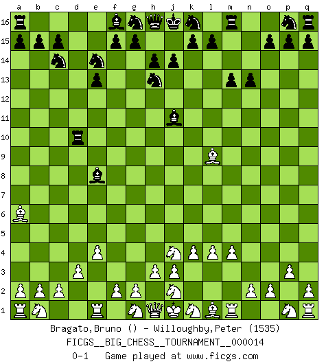 Last move : 0-1 2007 October 28 21:46:6 [Event "FICGS__BIG_CHESS__TOURNAMENT__000014"] [Site "FICGS"] [Date "2007.10.23"] [Round "1"] [White "Bragato,Bruno"] [Black "Willoughby,Peter"] [Result "0-1"] [WhiteElo ""] [BlackElo "1535"] 1.p2-p3 j15-h13 2.k2-k4 m15-m13 3.o1-p2 n15-n13 4.l2-l4 e15-e13 5.e2-e4 d15-d13 6.p2-d13 h15-g13 7.f1-a6 b16-c14 8.d2-d3 e16-d16 9.d13-a10 l16-m15 10.c1-l9 m15-e8 11.h2-j4 d16-d10 12.a10-c12 c16-e14 13.c12-e14 g13-e14 14.m2-m4 o16-j11 0-1 Follow this game move after move (download)The tactician must know what to do whenever something needs doing; the strategist must know what to do when nothing needs doing. (Savielly Tartakover) Du musst nicht gut spielen, es reicht, wenn du besser spielst als dein Gegner. (Anonymous) Todos los Maestros de Ajedrez fueron un día unos principiantes. (Chernev) Ce n'est pas pour s'amuser qu'il joue aux échecs : il célèbre un culte. (Vladimir Nabokov) At last I discovered the true beauty of chess. So I proposed to her. (Dinesh De Silva)