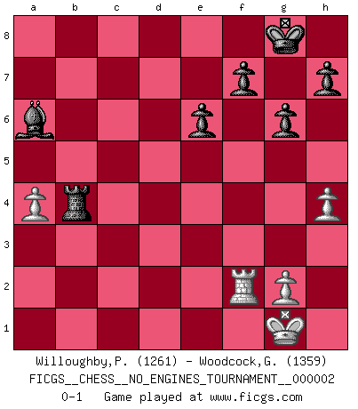 Last move : 0-1 2008 February 6 10:58:49 [Event "FICGS__CHESS__NO_ENGINES_TOURNAMENT__000002"] [Site "FICGS"] [Date "2007.10.23"] [Round "1"] [White "Willoughby,Peter"] [Black "Woodcock,Graham"] [Result "0-1"] [WhiteElo "1261"] [BlackElo "1359"] 1.e4 c5 2.Nf3 a6 3.d4 cxd4 4.Nxd4 g6 5.Be3 Bg7 6.c3 Nc6 7.Bc4 Nf6 8.Nd2 O-O 9.O-O d5 10.exd5 Nxd5 11.N2f3 Nxe3 12.fxe3 Bg4 13.Nxc6 bxc6 14.Qxd8 Rfxd8 15.Nd4 e6 16.Nxc6 Rd7 17.Nd4 a5 18.Bb5 Rd6 19.Bc6 Rc8 20.a3 R8xc6 21.Nxc6 Rxc6 22.Rf4 Be2 23.Kf2 Bb5 24.a4 Ba6 25.Rd1 Rb6 26.b4 Bxc3 27.bxa5 Rb2+ 28.Kg1 Bxa5 29.h4 Bd2 30.Rf2 Bxe3 31.Rdf1 Bxf2+ 32.Rxf2 Rb4 0-1 Sicilian : O'Kelly variation Kingside Castling by player Black (move 8) Kingside Castling by player White (move 9) Player Black won this chess game. Follow this game move after move (download)All that matters on the Chessboard is good moves. (Bobby Fischer) Später, ... hatte ich zunehmend Erfolg in entscheidenden Partien. Vielleicht weil ich eine einfache Wahrheit erkannte: nicht nur ich hatte Angst, auch mein Gegner. (Mikhail Nekhemyevich Tal) El Ajedrez es como la guerra en un tablero. (Bobby Fischer) Des combinaisons [dans le jeu d'échecs] pareilles à des mélodies. Je crois entendre pour ainsi dire la musique des coups... (Vladimir Nabokov) Gambling is the son of avarice and the father of despair. (French proverb)