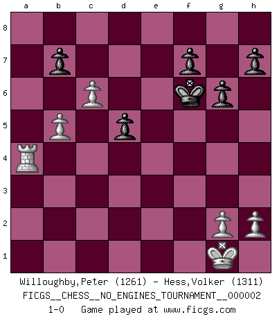 Last move : 1-0 2007 November 4 23:43:13 [Event "FICGS__CHESS__NO_ENGINES_TOURNAMENT__000002"] [Site "FICGS"] [Date "2007.10.23"] [Round "1"] [White "Willoughby,Peter"] [Black "Hess,Volker"] [Result "1-0"] [WhiteElo "1261"] [BlackElo "1311"] 1.e4 d6 2.d4 Nf6 3.Nc3 g6 4.Bg5 Bg7 5.Nf3 Bg4 6.Be2 O-O 7.O-O Na6 8.Qd3 c5 9.dxc5 Nxc5 10.Qe3 Bxf3 11.Bxf3 Qb6 12.Nd1 Rfe8 13.e5 Nfd7 14.Bf4 dxe5 15.Bh6 e4 16.Bg4 Nf6 17.Bxg7 Kxg7 18.Be2 Rad8 19.c3 Nd3 20.Qxb6 axb6 21.b4 b5 22.f3 Nf4 23.Bxb5 exf3 24.Rxf3 N4d5 25.Bxe8 Rxe8 26.a4 Ra8 27.b5 Nb6 28.Rf4 Nfd5 29.Rd4 e6 30.c4 Nb4 31.Ne3 Rxa4 32.Rxa4 Nxa4 33.c5 Nd5 34.Nxd5 exd5 35.Rxa4 Kf6 36.c6 1-0 Pirc : Byrne variation Kingside Castling by player Black (move 6) Kingside Castling by player White (move 7) Player White won this chess game. Follow this game move after move (download)Everything is in a state of flux, and this includes the world of Chess. (Mikhail Botvinnik) Alle offensichtlichen Züge sehen nach dem Spiel in der Analyse verdächtig aus. (Viktor Kortschnoi) En manos de Fischer's, una diminuta ventaja teórica es tan buena como tener una Reina de ventaja. (Isaac Kashdan) Vous n'êtes pas toujours obligé de jouer le meilleur coup. Un coup doit être actif, entreprenant, correct et beau ! (David Bronstein) If you know the enemy and know yourself you need not fear the results of a hundred battles. (Sun Tzu)