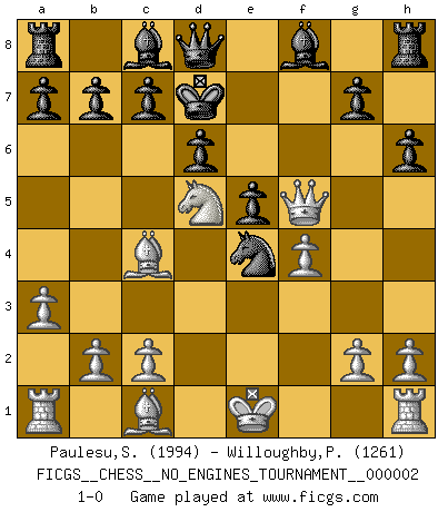 Last move : 1-0 2007 October 30 9:25:1 [Event "FICGS__CHESS__NO_ENGINES_TOURNAMENT__000002"] [Site "FICGS"] [Date "2007.10.23"] [Round "1"] [White "Paulesu,Sebastiano"] [Black "Willoughby,Peter"] [Result "1-0"] [WhiteElo "1994"] [BlackElo "1261"] 1.a3 e5 2.d4 Nc6 3.e4 Nxd4 4.Nf3 Nxf3+ 5.Qxf3 Qf6 6.Qg3 d6 7.Nc3 h6 8.Nd5 Qd8 9.Bc4 Nf6 10.f4 Nxe4 11.Qf3 f5 12.Qh5+ Kd7 13.Qxf5+ 1-0 Anderssen's Opening Player White won this chess game. Follow this game move after move (download)I give 98 percent of my mental energy to Chess. Others give only 2 percent. (Bobby Fischer) Schach ist Leben. (Robert James Fischer) Debemos de asegurarnos de que el Ajedrez no se convierta en un lenguaje muerto, muy interesante, pero tan solo para un grupo muy pequeño. (Sytze Faber) On peut tirer plus d'utilité d'une partie perdue que de 100 parties gagnées. (Capablanca) I have opinions of my own - strong opinions - but I don't always agree with them. (George Bush)