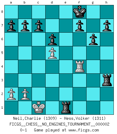 Last move : 0-1 2007 December 19 22:48:21 [Event "FICGS__CHESS__NO_ENGINES_TOURNAMENT__000002"] [Site "FICGS"] [Date "2007.10.23"] [Round "1"] [White "Neil,Charlie"] [Black "Hess,Volker"] [Result "0-1"] [WhiteElo "1309"] [BlackElo "1311"] 1.e4 d6 2.d4 Nf6 3.Nc3 g6 4.Be3 Bg7 5.h3 O-O 6.Qd2 Nbd7 7.Bd3 e5 8.Nf3 exd4 9.Nxd4 Ne5 10.f4 Nxd3+ 11.Qxd3 Re8 12.O-O-O Qe7 13.g4 Nxe4 14.Nxe4 Qxe4 15.Qxe4 Rxe4 16.Bf2 Rxf4 17.Nb3 Rxf2 18.Rhe1 Be6 19.c3 Rh2 20.Nd4 Bxd4 21.cxd4 Rxh3 22.d5 Bxg4 23.Rd4 Kf8 24.Rxg4 Re8 25.Rf4 Rxe1+ 0-1 Pirc defense Kingside Castling by player Black (move 5) Queenside Castling by player White (move 12) Player Black won this chess game. Follow this game move after move (download)Bobby just drops the pieces and they fall on the right squares. (Miguel Najdorf) Ich bewundere Kasparows phantasievolle Angriffssiege aus den Achtzigern und Neunzigern, aber wenn man sie mit dem Computer überprüft, nimmt der Computer in jeder zweiten Partie die Opfer an, verteidigt sich und gewinnt. (Vladimir Kramnik) De todos mis libros Rusos, la defensa contiene y difunde el 'calor' mas grande que pudiese verse extraño al observar lo supremamente abstracto que el Ajedrez supuestamente es. (Vladimir Nabokov) Je ne suis pas le dernier à jouer lâchement des coups douteux pendant le zeïtnot de l'adversaire pour l'achever: en effet les coups qui font le plus peur sont ceux que l'on ne comprend pas. Je me fais souvent peur quand je joue. (Un professeur anonyme) Your best chance to get a Royal Flush in a casino is in the bathroom. (Anonymous)