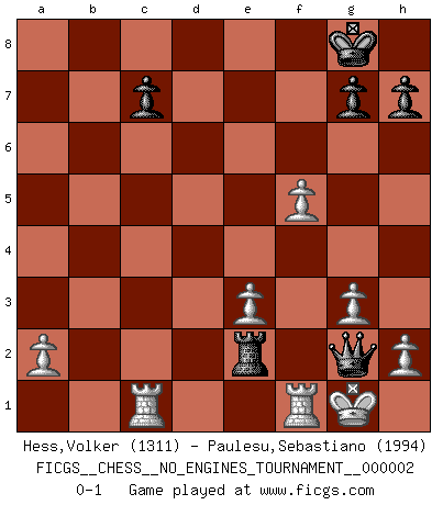Last move : 0-1 2007 October 31 11:59:2 [Event "FICGS__CHESS__NO_ENGINES_TOURNAMENT__000002"] [Site "FICGS"] [Date "2007.10.23"] [Round "1"] [White "Hess,Volker"] [Black "Paulesu,Sebastiano"] [Result "0-1"] [WhiteElo "1311"] [BlackElo "1994"] 1.c4 b5 2.cxb5 a6 3.bxa6 Bxa6 4.g3 e5 5.Bg2 Nc6 6.Nf3 Bc5 7.O-O e4 8.Ne1 Nf6 9.Nc3 O-O 10.d3 exd3 11.exd3 Nd4 12.Bxa8 Qxa8 13.Be3 Nd5 14.Bxd4 Bxd4 15.Qg4 Nxc3 16.bxc3 Bxc3 17.Rc1 Ba5 18.Qxd7 Bc8 19.Qc6 Bb7 20.Qc5 Bb6 21.Qc4 Re8 22.Nc2 Bh1 23.Qe4 Bxe4 24.dxe4 f5 25.exf5 Re2 26.Ne3 Bxe3 27.fxe3 Qg2+ 0-1 English : Jaenisch gambit Kingside Castling by player White (move 7) Kingside Castling by player Black (move 9) Player Black won this chess game. Follow this game move after move (download)Only sissies Castle. (Rob Sillars) Über Kasparov: Es ist offensichtlich, daß er in einem totalitären Staat aufwuchs und deshalb zu diktatorischen Zügen neigt. (Viktor Kortschnoi) El Ajedrez no es como la vida... ¡tiene reglas!. (Mark Pasternak) Si le désir cupide (et stupide) de gagner est une inépuisable source de souffrance, une combinaison brillante sur l'échiquier est une découverte : le coquelicot qui s'épanouit lorsque apparaît la Voie Lactée. (Arrabal) It's not enough to succeed. Others must fail. (Gore Vidal)