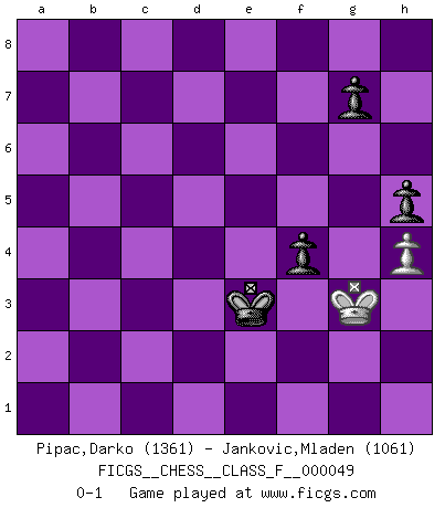 Last move : 0-1 2008 August 25 9:25:52 [Event "FICGS__CHESS__CLASS_F__000049"] [Site "FICGS"] [Date "2007.10.25"] [Round "1"] [White "Pipac,Darko"] [Black "Jankovic,Mladen"] [Result "0-1"] [WhiteElo "1361"] [BlackElo "1061"] 1.e4 e5 2.Nf3 Nc6 3.Nc3 Nf6 4.Bb5 Bb4 5.Bxc6 dxc6 6.d4 O-O 7.Bd2 exd4 8.Nxd4 Qxd4 9.O-O Nxe4 10.Nxe4 Qxe4 11.Re1 Qd4 12.Qe2 Bf5 13.Rad1 Qxb2 14.Rb1 Qxb1 15.Rxb1 Bxd2 16.Qxd2 b6 17.Re1 Rad8 18.Qf4 Bxc2 19.Qxc7 Rd1 20.Rxd1 Bxd1 21.Qxc6 Be2 22.f3 b5 23.Qd7 a6 24.Qc6 a5 25.a4 b4 26.Qb6 Ra8 27.Qc6 Rf8 28.Qc5 b3 29.Qxa5 h6 30.Qb4 Bd1 31.Kf1 Re8 32.a5 Bc2 33.a6 Kh7 34.Qb7 Re5 35.a7 Ra5 36.Ke1 Rxa7 37.Qxa7 b2 38.Qa2 b1Q 39.Qxb1 Bxb1 40.Kf2 Kg6 41.Kg3 Kf5 42.h4 h5 43.f4 Be4 44.Kf2 Bxg2 45.Kxg2 Kxf4 46.Kh3 f5 47.Kg2 Ke3 48.Kg3 f4+ 0-1 Four knights : double Ruy Lopez Kingside Castling by player Black (move 6) Kingside Castling by player White (move 9) Promotion Queen by player Black (move 38) 10 pieces endgame at move 39 : White KQPPP , Black KBPPP WHITE : King + 1 Queen 3 Pawns BLACK : King + 1 Bishop 3 Pawns 9 pieces endgame at move 39 : White KPPP , Black KBPPP WHITE : King + 3 Pawns BLACK : King + 1 Bishop 3 Pawns 8 pieces endgame at move 44 : White KPP , Black KBPPP WHITE : King + 2 Pawns BLACK : King + 1 Bishop 3 Pawns 7 pieces endgame at move 45 : White KPP , Black KPPP WHITE : King + 2 Pawns BLACK : King + 3 Pawns 6 pieces endgame at move 45 : White KP , Black KPPP WHITE : King + 1 Pawn BLACK : King + 3 Pawns Player Black won this chess game. Follow this game move after move (download)Fischer is under obligation to nobody. (Joseph Platz) Ein Kibitz ist einer, der deinem Gegner gute Ratschläge gibt. (Andrew Soltis) Yo nunca en mi vida he jugado la Defensa Francesa, que viene siendo la más aburrida de todas las Aperturas. (Wilhelm Steinitz) La victoire dans une partie d'Echecs appartient la plupart du temps à celui qui voit un peu plus loin que l'adversaire. (Lasker) This is where the fun begins. (Anakin Skywalker in Star Wars ep.3)