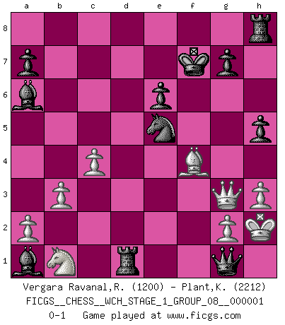 Last move : 0-1 2006 October 24 1:47:28 [Event "FICGS__CHESS__WCH_STAGE_1_GROUP_08__000001"] [Site "FICGS"] [Date "2006.07.01"] [Round "1"] [White "Vergara Ravanal,Raul Andres"] [Black "Plant,Kevin D."] [Result "0-1"] [WhiteElo "1200"] [BlackElo "2212"] 1.f4 c5 2.Nf3 Nc6 3.e4 e6 4.Bb5 Nf6 5.Bxc6 bxc6 6.e5 Ng4 7.d4 Ba6 8.b3 Be7 9.c4 cxd4 10.Nxd4 h5 11.O-O d6 12.Nxc6 Qb6+ 13.Nd4 dxe5 14.fxe5 Bc5 15.Qf3 Bxd4+ 16.Kh1 O-O-O 17.Qa8+ Kd7 18.Rxf7+ Ke8 19.Qf3 Nxe5 20.Qg3 Kxf7 21.Bf4 Bxa1 22.h3 Rd1+ 23.Kh2 Qg1+ 0-1 Bird's Opening Kingside Castling by player White (move 11) Queenside Castling by player Black (move 16) Player Black won this chess game. Follow this game move after move (download)With or without the title, Bobby Fischer was unquestionably the greatest player of his time. (Burt Hochberg) Im Schach gewinnt jeder. Hat man Freunde am Spiel - und das ist die Hauptsache - ist auch der Verlust einer Partie kein Unglück. (David Bronstein) Estaba muy claro de que el punto vulnerable del Gran Maestro Americano (Bobby Fischer) radicaba en las posiciones de doble filo, colgantes, irracionales, donde el siempre falló en encontrar un triunfo aún en una posición de clara victoria. (Efim Geller) L'attaque fait le spectacle, la défense gagne les matchs. (Dicton footballistique) There is no vagueness without wind. (Chinese proverb)