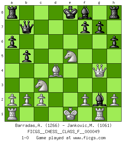 Last move : 1-0 2008 January 18 14:37:11 [Event "FICGS__CHESS__CLASS_F__000049"] [Site "FICGS"] [Date "2007.10.25"] [Round "1"] [White "Barradas,Anderson"] [Black "Jankovic,Mladen"] [Result "1-0"] [WhiteElo "1266"] [BlackElo "1061"] 1.e4 e5 2.Nf3 Nc6 3.Bb5 a6 4.Ba4 b5 5.Bb3 Nf6 6.d3 d6 7.Bg5 h6 8.Be3 d5 9.exd5 Nxd5 10.Bxd5 Bb7 11.Bxc6+ Bxc6 12.Nxe5 Bxg2 13.Rg1 Qd5 14.d4 c5 15.Nc3 Qb7 16.Qg4 cxd4 17.Bxd4 1-0 Ruy Lopez : Caro variation Player White won this chess game. Follow this game move after move (download)Best by test: 1. e4 (Bobby Fischer) Was ist der Unterschied zwischen einem Strassenarbeiter und einem Schachspieler? --Der Schachspieler bewegt sich ab und zu. (Anonymous) Entre mas años cumplo, mas valoro los Peones. (Keres) RxDa4 pat (...) Animated gif is worth one mega-word. (Unknown)