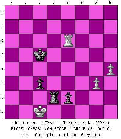 Last move : 0-1 2006 September 19 21:47:5 [Event "FICGS__CHESS__WCH_STAGE_1_GROUP_08__000001"] [Site "FICGS"] [Date "2006.07.01"] [Round "1"] [White "Marconi,Ralph"] [Black "Cheparinov,Nedelcho"] [Result "0-1"] [WhiteElo "2095"] [BlackElo "1951"] 1.d4 Nf6 2.c4 e6 3.Nc3 Bb4 4.Qc2 d5 5.cxd5 exd5 6.Bg5 h6 7.Bh4 c5 8.dxc5 g5 9.Bg3 Ne4 10.e3 Qf6 11.Nf3 Nc6 12.Bb5 Nxc3 13.Bxc6+ Qxc6 14.bxc3 Bxc5 15.O-O Be6 16.Rab1 O-O 17.Qd3 Bb6 18.Nd4 Qc4 19.Qxc4 dxc4 20.Nxe6 fxe6 21.Rb4 Rac8 22.Be5 Rf7 23.Rd1 Rcf8 24.Rb2 Rd8 25.Rxd8+ Bxd8 26.Rb4 Rf5 27.Bd4 Ra5 28.Rxb7 e5 29.Rd7 Bf6 30.Bxa7 Rxa2 31.Kf1 e4 32.Bd4 Ra1+ 33.Ke2 Ra2+ 34.Kd1 Ra1+ 35.Kc2 Ra2+ 36.Kb1 Rxf2 37.Bxf6 Rxf6 38.Kc2 g4 39.Rd4 Kg7 40.Kd1 Rf2 41.Rd2 Rf1+ 42.Ke2 Rc1 43.Rd7+ Kf6 44.Rd6+ Kg5 45.g3 Rc2+ 46.Rd2 Rxc3 47.Rd5+ Kf6 48.Rd6+ Ke5 49.Rxh6 Rc2+ 50.Kd1 Rg2 51.Rh5+ Kd6 52.Rg5 c3 53.Rxg4 Kd5 54.h4 Kc4 55.Rg5 Kd3 56.Rd5+ Kxe3 57.Kc1 Rd2 58.Ra5 Kd4 59.Ra4+ Kd3 60.Ra8 e3 61.Rd8+ Kc4 62.Rc8+ Kb4 63.Rb8+ Ka5 64.Ra8+ Kb6 65.Rb8+ Ka7 66.Re8 e2 67.Re7+ Kb6 68.Re6+ Kc5 0-1 Nimzo-Indian : Classical, Noa variation, 5.cd ed Kingside Castling by player White (move 15) Kingside Castling by player Black (move 16) 10 pieces endgame at move 49 : White KRPPP , Black KRPPP WHITE : King + 1 Rook 3 Pawns BLACK : King + 1 Rook 3 Pawns 9 pieces endgame at move 53 : White KRPPP , Black KRPP WHITE : King + 1 Rook 3 Pawns BLACK : King + 1 Rook 2 Pawns 8 pieces endgame at move 56 : White KRPP , Black KRPP WHITE : King + 1 Rook 2 Pawns BLACK : King + 1 Rook 2 Pawns Player Black won this chess game. Follow this game move after move (download)Botvinnik tried to take the mystery out of Chess, always relating it to situations in ordinary life. He used to call Chess a typical inexact problem similar to those which people are always having to solve in everyday life. (Garry Kasparov) Du weisst es gibt ein Problem mit Computern und Fernschach, wenn jeder eine Rating von 2450 hat. (John Christen Knudsen) Aquel que teme a un Peón de Reina aislado, debería de retirarse del Ajedrez. (Siegbert Tarrasch) Avant la finale, les dieux ont créé le milieu de partie. (Tarrasch) Train yourself to let go of everything you fear to lose. (Master Yoda in Star Wars ep.3)