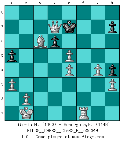 Last move : 1-0 2007 November 17 18:17:45 [Event "FICGS__CHESS__CLASS_F__000049"] [Site "FICGS"] [Date "2007.10.25"] [Round "1"] [White "Tiberiu,Maran"] [Black "Benreguia,Frederic"] [Result "1-0"] [WhiteElo "1400"] [BlackElo "1148"] 1.e4 e5 2.Bc4 c5 3.Nc3 d6 4.Nf3 Bg4 5.h3 Bxf3 6.Qxf3 Nh6 7.d3 f6 8.Bxh6 gxh6 9.Qh5+ Kd7 10.Qf7+ Be7 11.Nd5 Nc6 12.Nxf6+ Kc8 13.Qe6+ Kc7 14.Nd5+ Kb8 15.Nxe7 Nxe7 16.O-O-O Ng6 17.g3 h5 18.Rhf1 h4 19.Kb1 Ne7 20.c3 Ng6 21.a3 a5 22.d4 cxd4 23.cxd4 Re8 24.Qd5 Ne7 25.Qb5 Nc6 26.dxe5 Rxe5 27.Bd5 Kc7 28.g4 Qd7 29.Rc1 b6 30.Rxc6+ Kd8 31.Qxb6+ Ke7 32.f4 Rc8 33.fxe5 Rxc6 34.Bxc6 Qe6 35.Qc7+ Qd7 36.Qxd7+ 1-0 Bishop's Opening Queenside Castling by player White (move 16) Player White won this chess game. Follow this game move after move (download)In Chess, as it is played by masters, chance is practically eliminated. (Emanuel Lasker) In Buenos Aires ist es nicht mein vorrangiges Ziel ein starkes Turnier zu organisieren, sondern ein Turnier für Gentlemen. Ich würde nie Kamsky einladen. Ich mag keine Probleme. (Miguel Najdorf) No nos podemos resistir a la fascinación de un sacrificio ya que la pasión por los sacrificios es parte de la naturaleza de un jugador de Ajedrez. (Rudolf Spielman) Le succès, c'est être capable d'aller d'échec en échec sans perdre son enthousiasme. (Winston Churchill) Wisdom begins at the end. (Daniel Webster)