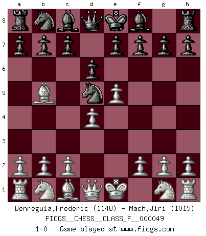 Last move : 1-0 2007 December 7 20:28:58 [Event "FICGS__CHESS__CLASS_F__000049"] [Site "FICGS"] [Date "2007.10.25"] [Round "1"] [White "Benreguia,Frederic"] [Black "Mach,Jiri"] [Result "1-0"] [WhiteElo "1148"] [BlackElo "1019"] 1.e4 Nf6 2.e5 Nd5 3.d4 d6 4.Bb5+ 1-0 This chess game has been lost on time (started : 2007.10.25 0:1:36) Alekhine's defense Player White won this chess game. Follow this game move after move (download)Blessed be the memory of him who gave the world this immortal game. (A. G. Gardiner) Ich habe kein Problem mit Frauen, sondern nur mit dem Niveau ihres Schachspiels (Judith Polgar) En el tablero, la mentira e hipocresía no sobreviven mucho. (Emanuel Lasker) Fischer est le meilleur joueur du monde et Karpov n'est qu'un joueur de bistrot. (Garry Kasparov, agé de 16 ans) Nowadays, anyone who cannot speak English and is incapable of using the Internet is regarded as backward. (Al-Waleed bin Talal)