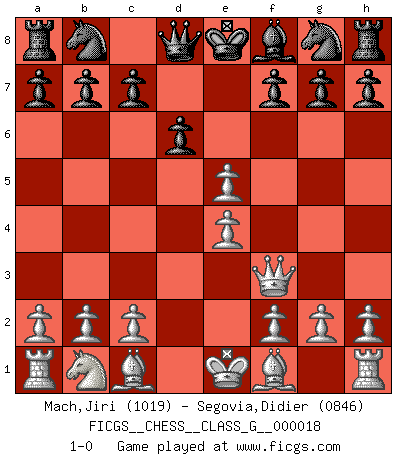 Last move : 1-0 2008 January 16 23:22:12 [Event "FICGS__CHESS__CLASS_G__000018"] [Site "FICGS"] [Date "2007.10.25"] [Round "1"] [White "Mach,Jiri"] [Black "Segovia,Didier"] [Result "1-0"] [WhiteElo "1019"] [BlackElo "0846"] 1.e4 e5 2.Nf3 d6 3.d4 Bg4 4.dxe5 Bxf3 5.Qxf3 1-0 This chess game has been lost on time (started : 2007.10.25 0:3:38) Philidor's defense Player White won this chess game. Follow this game move after move (download)Chess is mental torture. (Garry Kasparov) Ohne Leiden bildet sich kein Charakter. (Ernst Freiherr von Feuchtersleben) Nunca antes ha habido un jugador de Ajedrez con tal conocimiento a fondo de las complejidades del juego y una inmensa voluntad absolutamente indomable de ganar. Yo pienso que Fischer es el jugador mas grande que jamás haya existido. (Lisa Lane) Des points faibles ou des trous dans la position de l'adversaire doivent être occupés par des pièces et non pas par des pions. (Siegbert Tarrasch) All politicians must be presumed guilty until they are proven innocent. (Dinesh De Silva)