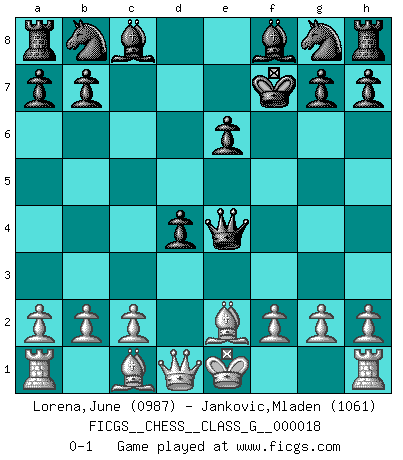 Last move : 0-1 2008 January 12 23:7:22 [Event "FICGS__CHESS__CLASS_G__000018"] [Site "FICGS"] [Date "2007.10.25"] [Round "1"] [White "Lorena,June"] [Black "Jankovic,Mladen"] [Result "0-1"] [WhiteElo "0987"] [BlackElo "1061"] 1.d4 d5 2.Nc3 c5 3.Nf3 e6 4.e4 dxe4 5.Ne5 cxd4 6.Nxe4 Qd5 7.Nxf7 Qxe4+ 8.Be2 Kxf7 0-1 This chess game has been lost on time (started : 2007.10.25 0:3:38) Queen's pawn : Chigorin variation Player Black won this chess game. Follow this game move after move (download)Fischer is completely natural. He plays no roles. He's like a child. Very, very simple. (Zita Rajcsanyi) Man braucht nicht immer den besten Zug zu spielen: Ein Zug muß aktiv, unternehmungslustig, korrekt und schön sein. (David Bronstein) El Ajedrez demanda una total concentración. (Bobby Fischer) Karpov est une pièce de musée. (Garry Kasparov) How many people work in NATO Headquarters ? - About half of them. (Dirk Stikker, NATO general secretary)