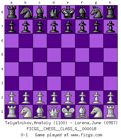 Last move : 0-1 2007 December 6 20:25:58 [Event "FICGS__CHESS__CLASS_G__000018"] [Site "FICGS"] [Date "2007.10.25"] [Round "1"] [White "Telyatnikov,Anatoly"] [Black "Lorena,June"] [Result "0-1"] [WhiteElo "1100"] [BlackElo "0987"] 0-1 This chess game has been lost on time (started : 2007.10.25 0:3:38) Player Black won this chess game. Follow this game move after move (download)When you play Bobby, it is not a question if you win or lose. It is a question if you survive. (Boris Spassky) Wenn Capablanka heute auf der Schachbühne erscheinen würde, hätte er ein halbes Jahr gebraucht um sich die Schachtheorie anzueignen. Und dann hätte er alles und jeden besiegt. (Mikhail Moiseyevich Botvinik) Hay dos clases de hombres: aquellos que se conforman en dejarse llevar por las circunstancias y que juegan barajas y aquellos decididos a controlar las circunstancias y que juegan al Ajedrez. (Mortimer Collins) Je ne crois pas en la psychologie, je crois aux bons coups. (Robert Fischer) A person who never made a mistake never tried anything new. (Albert Einstein)
