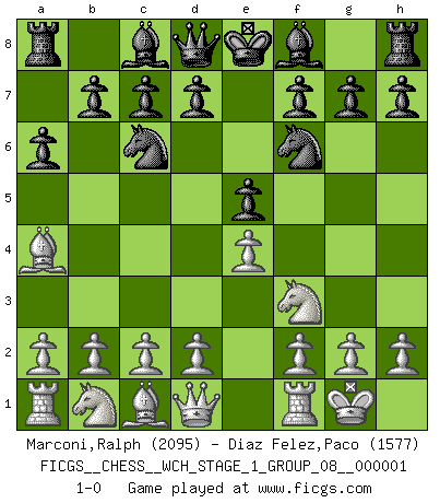 Last move : 1-0 2006 August 5 3:45:12 [Event "FICGS__CHESS__WCH_STAGE_1_GROUP_08__000001"] [Site "FICGS"] [Date "2006.07.01"] [Round "1"] [White "Marconi,Ralph"] [Black "Diaz Felez,Paco"] [Result "1-0"] [WhiteElo "2095"] [BlackElo "1577"] 1.e4 e5 2.Nf3 Nc6 3.Bb5 a6 4.Ba4 Nf6 5.O-O 1-0 This chess game has been lost on time (started : 2006.07.01 16:10:15) Ruy Lopez : 5.O-O Kingside Castling by player White (move 5) Player White won this chess game. Follow this game move after move (download)There is only one thing Fischer does in Chess without pleasure: to lose ! (Boris Spassky) Der Partner hat auch seine Existenzberechtigung. (Savielly Grigorievitsch Tartakower) Juega la Apertura como un libro, el Juego Medio como un mago y los Finales como una máquina. (Spielmann) Celui qui prend des risques peut perdre, celui qui n'en prend pas perd toujours. (Xavier Tartacover) It's not a bug - it's an undocumented feature. (Anonymous)