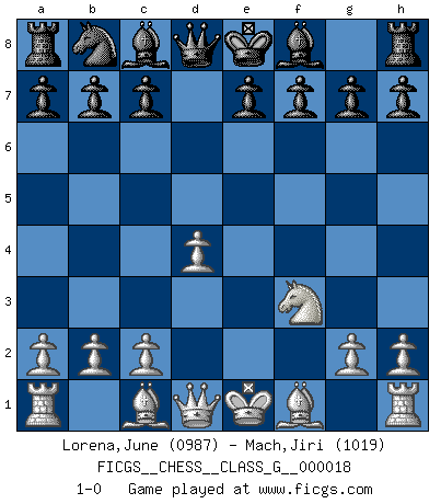 Last move : 1-0 2007 December 12 20:49:32 [Event "FICGS__CHESS__CLASS_G__000018"] [Site "FICGS"] [Date "2007.10.25"] [Round "1"] [White "Lorena,June"] [Black "Mach,Jiri"] [Result "1-0"] [WhiteElo "0987"] [BlackElo "1019"] 1.d4 d5 2.Nc3 Nf6 3.e4 Nxe4 4.Nxe4 dxe4 5.f3 exf3 6.Nxf3 1-0 This chess game has been lost on time (started : 2007.10.25 0:3:38) Blackmar-Diemer gambit Player White won this chess game. Follow this game move after move (download)White lost because he failed to remember the right continuation and had to think up the moves himself. (Siegbert Tarrasch) Sitze auf Deine Hände. (Siegbert Tarrasch) El Ajedrez es en su esencia, un juego. En su forma, un arte. Y en su ejecución, una ciencia. (Baron Tassilo) Aux échecs, l'amour-propre est satisfait quand on remporte la victoire, mais il n'y a pas de honte à être battu. (Benjamin Franklin) The man who strikes first admits that his ideas have given out. (Chinese proverb)