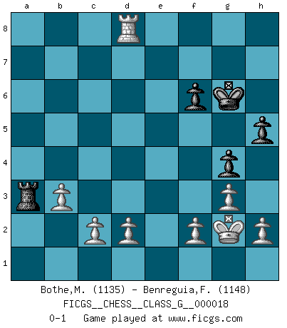 Last move : 0-1 2008 April 9 19:16:55 [Event "FICGS__CHESS__CLASS_G__000018"] [Site "FICGS"] [Date "2007.10.25"] [Round "1"] [White "Bothe,Matthias"] [Black "Benreguia,Frederic"] [Result "0-1"] [WhiteElo "1135"] [BlackElo "1148"] 1.e4 e5 2.Nf3 Nc6 3.Bc4 Nf6 4.Nc3 Nd4 5.Nxd4 exd4 6.Nd5 Nxd5 7.Bxd5 d6 8.O-O c6 9.Bc4 d5 10.exd5 cxd5 11.Bb5+ Bd7 12.a4 Bxb5 13.axb5 Bd6 14.Qg4 Qf6 15.Re1+ Be7 16.Ra4 h5 17.Qxd4 Qxd4 18.Rxd4 Rd8 19.Re3 a6 20.bxa6 bxa6 21.Red3 g5 22.Rxd5 f6 23.Ra5 Ra8 24.b3 Kf7 25.Ba3 Bd8 26.Rd7+ Ke6 27.Rd6+ Kf7 28.R5xa6 Rxa6 29.Rxa6 Re8 30.g3 Re1+ 31.Kg2 Ra1 32.Ra7+ Kg6 33.Rd7 Rxa3 34.Rxd8 g4 0-1 Two knights defense Kingside Castling by player White (move 8) Player Black won this chess game. Follow this game move after move (download)In complicated positions, Bobby Fischer hardly had to be afraid of anybody. (Paul Keres) Schach ist das Spiel, das die Verrückten gesund hält. (Albert Einstein) La caracteristica mas importante en la posición del Ajedrez es la actividad de las piezas. Esto es absolutamente fundamental en todas las fases del juego: Apertura, Juego Medio y especialmente Finales. La limitación primordial en la actividad de una pieza, es la estructuración de los Peones. (Michael Stean) Il n'y a pas eu de défaite parce que je ne crois pas que cet ordinateur ait jamais existé. IBM a triché en refusant d'imprimer les modes de recherche de la machine. C'est évident, pendant le match, des coups décisifs ont été joués par des êtres humains. Aujourd'hui, les meilleurs spécialistes en informatique ne peuvent toujours pas expliquer comment Deep-Blue a pu jouer contre la logique des ordinateurs. IBM a gagné une guerre de communication, mais ils sont incapables de prouver que l'ordinateur a gagné tout seul. (Garry Kasparov) There's no money in correspondence chess. (John Knudsen)