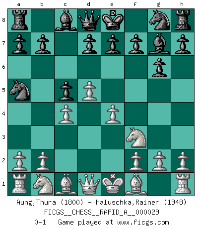Last move : 0-1 2008 February 4 0:38:55 [Event "FICGS__CHESS__RAPID_A__000029"] [Site "FICGS"] [Date "2007.10.26"] [Round "1"] [White "Aung,Thura"] [Black "Haluschka,Rainer"] [Result "0-1"] [WhiteElo "1800"] [BlackElo "1948"] 1.e4 c5 2.Nf3 Nc6 3.d4 g6 4.d5 Na5 5.c4 Bg7 0-1 This chess game has been lost on time (started : 2007.10.26 12:23:49) Sicilian defense Player Black won this chess game. Follow this game move after move (download)Chess holds its master in its own bonds, shackling the mind and brain so that the inner freedom of the very strongest must suffer. (Albert Einstein) Die unerbitterlichsten Regeln im Schach sind die Ausnahmen. (Savielly Grigorievitsch Tartakower) Si tu oponente no puede hacer nada activo, entonces no apures la posición; En vez de eso, dejalo estar sentado ahí, sufriendo y rogandote por un empate. (Jeremy Silman) Les pièces de l'échiquier étaient impitoyables. Elles le retenaient, elles l'absorbaient. Il y avait de l'horreur en cela, mais aussi une harmonie unique. Car, qu'y a-t-il dans le monde, à part les échecs ? (V. Nabokov) You have to believe in yourself. (Sun Tzu)