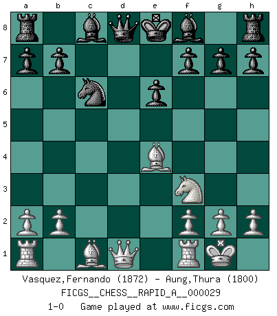 Last move : 1-0 2008 January 9 23:0:21 [Event "FICGS__CHESS__RAPID_A__000029"] [Site "FICGS"] [Date "2007.10.26"] [Round "1"] [White "Vasquez,Fernando"] [Black "Aung,Thura"] [Result "1-0"] [WhiteElo "1872"] [BlackElo "1800"] 1.e4 c5 2.d4 cxd4 3.c3 dxc3 4.Nxc3 e6 5.Nf3 Nc6 6.Bc4 Nf6 7.O-O Nxe4 8.Nxe4 d5 9.Bd3 dxe4 10.Bxe4 1-0 This chess game has been lost on time (started : 2007.10.26 12:23:49) Sicilian : Smith-Morra gambit Kingside Castling by player White (move 7) Player White won this chess game. Follow this game move after move (download)Every Chess master was once a beginner. (Chernev) Bis zum Jahr 1971 verlief in meiner Schachkariere alles glatt. Dieses dramatische Match [Fischer-Taimanov 6:0] machte mein Leben zur Hölle. (Mark Taimanov) Fischer era un maestro de claridad y un Rey del posicionamiento astuto. Sus oponentes podían ver hacia donde se dirigía pero eran impotentes para detenerlo. (Bruce Pandolfini) Le thème de l'attaque double intervient d'une manière ou d'une autre dans l'immense majorité des combinaisons. (Youri Averbakh) Unless in communicating with it one says exactly what one means, trouble is bound to result. (Alan Turing, about computers)