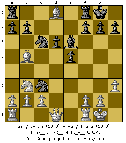 Last move : 1-0 2008 January 16 11:21:48 [Event "FICGS__CHESS__RAPID_A__000029"] [Site "FICGS"] [Date "2007.10.26"] [Round "1"] [White "Singh,Arun"] [Black "Aung,Thura"] [Result "1-0"] [WhiteElo "1800"] [BlackElo "1800"] 1.e4 c5 2.Nf3 d6 3.d4 cxd4 4.Nxd4 Nf6 5.Nc3 e5 6.Nb3 Be6 7.Bg5 Be7 8.Bb5+ Nc6 9.O-O O-O 10.h3 Nxe4 11.Bxe7 Nxc3 12.Bxd8 1-0 This chess game has been lost on time (started : 2007.10.26 12:23:49) Sicilian Kingside Castling by player White (move 9) Kingside Castling by player Black (move 9) Player White won this chess game. Follow this game move after move (download)There are tough players and nice guys, and I'm a tough player. (Bobby Fischer) Kein Schachspieler kann gut schlafen. (H. G. Wells) No hay precio que no valga la pena por la cabellera del Rey enemigo. (Koblentz) La tactique, c'est ce que vous faites quand il y a quelque chose à faire; la stratégie, c'est ce que vous faites quand il n'y a rien à faire. (Savielli Tartacower) A shortcut is the longest distance between two points. (Don Groves)
