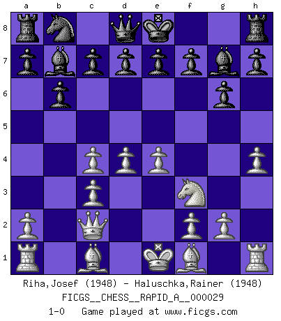 Last move : 1-0 2007 December 12 20:49:32 [Event "FICGS__CHESS__RAPID_A__000029"] [Site "FICGS"] [Date "2007.10.26"] [Round "1"] [White "Riha,Josef"] [Black "Haluschka,Rainer"] [Result "1-0"] [WhiteElo "1948"] [BlackElo "1948"] 1.c4 b6 2.Nc3 Bb7 3.d4 Nf6 4.Nf3 Ne4 5.Qc2 Nxc3 6.bxc3 g6 7.e4 Bg7 8.h4 1-0 This chess game has been lost on time (started : 2007.10.26 12:23:49) English Opening Player White won this chess game. Follow this game move after move (download)You sit at the board and suddenly your heart leaps. Your hand trembles to pick up the piece and move it. But what Chess teaches you is that you must sit there calmly and think about whether it's really a good idea and whether there are other better ideas. (Stanley Kubrick) Moralische Siege zählen nicht. (Savielly Grigorievitsch Tartakower) Cuando me preguntan: -¿Cual es el secreto que te hace hacer mejores movidas que tus oponentes?, Yo respondo: Me da gusto que me pregunten eso, porque, como veran, hay una simple razón. Yo pienso mis propias movidas y dejo a mi oponente que el piense las suyas. (Alexander Alekhine) Ce qui caractérise les parties de combat, c'est que si le défenseur a constamment de difficiles problèmes à résoudre, l'attaquant doit chercher sans relâche de nouvelles possibilités d'attaque. (Koblentz) Employ the attack like tactic of defense. (Chinese proverb)