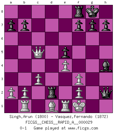 Last move : 0-1 2007 November 25 10:26:47 [Event "FICGS__CHESS__RAPID_A__000029"] [Site "FICGS"] [Date "2007.10.26"] [Round "1"] [White "Singh,Arun"] [Black "Vasquez,Fernando"] [Result "0-1"] [WhiteElo "1800"] [BlackElo "1872"] 1.e4 e5 2.Nf3 d6 3.d4 exd4 4.Nxd4 Nf6 5.Nc3 Be7 6.Bc4 O-O 7.O-O Nc6 8.Re1 Ne5 9.Bb3 c5 10.Nf3 Bg4 11.Bf4 Nfd7 12.Nd5 c4 13.Ba4 Bxf3 14.gxf3 Nb6 15.Nxb6 Qxb6 16.Rb1 Qa6 17.Bxe5 dxe5 18.Qd7 Bh4 19.c3 Rad8 20.Qb5 Qg6+ 21.Kf1 Qf6 22.Bd1 Qf4 23.Qxc4 Qxh2 24.Qc5 Rd2 0-1 Philidor : Exchange variation Kingside Castling by player Black (move 6) Kingside Castling by player White (move 7) Player Black won this chess game. Follow this game move after move (download)First-class players lose to second-class players because second-class players sometimes play a first-class game. (Siegbert Tarrasch) Die Fehler sind da, Sie warten nur darauf gemacht zu werden. (Savielly Grigorievitsch Tartakower) Cuando estes solo, cuando te sientas un extraño en el mundo, juega al Ajedrez. Esto levantará tu espiritu y será tu consejero de guerra. (Aristóteles) Les Echecs mettent en conflit, non pas deux intelligences, mais deux volontés. (Lasker) All politicians must be presumed guilty until they are proven innocent. (Dinesh De Silva)