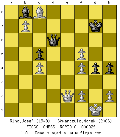 Last move : 1-0 2007 December 24 12:33:4 [Event "FICGS__CHESS__RAPID_A__000029"] [Site "FICGS"] [Date "2007.10.26"] [Round "1"] [White "Riha,Josef"] [Black "Skwarczylo,Marek"] [Result "1-0"] [WhiteElo "1948"] [BlackElo "2006"] 1.d4 Nf6 2.c4 g6 3.Nc3 Bg7 4.e4 d6 5.Nf3 O-O 6.Be2 e5 7.O-O Nc6 8.d5 Ne7 9.Nd2 c5 10.Rb1 Ne8 11.Nf3 f5 12.b4 b6 13.bxc5 bxc5 14.Ng5 Nc7 15.Qc2 h6 16.Nf3 Bd7 17.Bd2 Ne8 18.Bd3 Nf6 19.Rb7 Bc8 20.Rb5 a6 21.Rb2 Qc7 22.Rfb1 Ra7 23.Nh4 f4 24.Nf3 g5 25.Be2 g4 26.Nh4 h5 27.Bd3 Bh6 28.Rb6 Bg5 29.Nf5 Nxf5 30.exf5 Qe7 31.Ne4 Nxe4 32.Bxe4 Qf6 33.Rc6 Bd7 34.Ba5 Kh8 35.R1b6 Bxc6 36.dxc6 Re7 37.Qd3 Rc8 38.c7 Rexc7 39.Rxd6 Qf8 40.Bxc7 Rxc7 41.Rxa6 Bf6 42.a4 Rc8 43.a5 Qd8 44.Qb1 Kg7 45.Bd5 Rb8 46.Rb6 Rxb6 47.axb6 e4 48.b7 Be5 49.Qxe4 Kf6 50.g3 Qe7 51.gxf4 Bb8 52.Be6 Qd6 53.Bc8 Kg7 54.Qe3 h4 55.Qe2 1-0 King's Indian : Orthodox, Aronin-Taimanov variation (Yugoslav attack / Mar del Plata variation) Kingside Castling by player Black (move 5) Kingside Castling by player White (move 7) Player White won this chess game. Follow this game move after move (download)The hardest game to win is a won game. (Emanuel Lasker) Mein Gehirn das ist mein zweitwichtigstes Organ [Aus dem Film: Der Schläfer]. (Woody Allen) Una victoria por una combinación errónea, aunque sea espectacular, me llena de horror artístico. (Wilhelm Steinitz) Aux échecs, l'amour-propre est satisfait quand on remporte la victoire, mais il n'y a pas de honte à être battu. (Benjamin Franklin) Tree pose grows confidence. It roots me to this world. (Terri Guillemets)