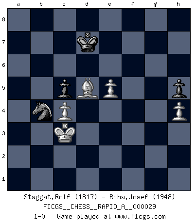 Last move : 1-0 2007 December 15 12:37:31 [Event "FICGS__CHESS__RAPID_A__000029"] [Site "FICGS"] [Date "2007.10.26"] [Round "1"] [White "Staggat,Rolf"] [Black "Riha,Josef"] [Result "1-0"] [WhiteElo "1817"] [BlackElo "1948"] 1.e4 e5 2.Nf3 Nc6 3.d4 exd4 4.Nxd4 Bc5 5.Nxc6 Qf6 6.Qf3 Qxf3 7.gxf3 dxc6 8.Be3 Bxe3 9.fxe3 Be6 10.Rg1 g6 11.Nd2 Rd8 12.Nb3 Nf6 13.Nd4 c5 14.Nxe6 fxe6 15.h4 Kf7 16.Rg5 b6 17.Bb5 a5 18.Rd1 Rxd1+ 19.Kxd1 Ne8 20.e5 Ng7 21.e4 Rc8 22.Bc6 Rd8+ 23.Ke2 Nh5 24.Rg1 Kf8 25.Ke3 Ke7 26.Bb5 Kf7 27.f4 Ng7 28.Rh1 Nh5 29.Re1 Ng7 30.Be2 a4 31.a3 c6 32.c4 Rd7 33.Rd1 Ke8 34.Rxd7 Kxd7 35.Kf3 h5 36.Bd3 Ke7 37.Ke3 Kd7 38.Bc2 b5 39.Bd3 b4 40.axb4 cxb4 41.Kd4 a3 42.bxa3 bxa3 43.Kc3 Ne8 44.Kb3 a2 45.Kxa2 Nc7 46.Bc2 Na6 47.Ka3 Kc7 48.Ka4 Nc5+ 49.Kb4 Na6+ 50.Kc3 c5 51.f5 gxf5 52.exf5 exf5 53.Bxf5 Nb4 54.Be4 Kd7 55.Bd5 1-0 Scotch game 10 pieces endgame at move 52 : White KBPPP , Black KNPPP WHITE : King + 1 Bishop 3 Pawns BLACK : King + 1 Knight 3 Pawns 9 pieces endgame at move 53 : White KBPPP , Black KNPP WHITE : King + 1 Bishop 3 Pawns BLACK : King + 1 Knight 2 Pawns Player White won this chess game. Follow this game move after move (download)Chess is like war on a board. (Bobby Fischer) Es gibt nur zwei wahre Schachgenies - das andere war Wilhelm Steinitz, der Weltmeister von 1872 bis 1894. (Robert James Fischer) El ganar no lo es todo... pero el perder es nada. (Mednis) Le plus grand jeu de l'esprit jamais inventé, plus vous l'apprenez, plus vous y prenez du plaisir. (Garry Kasparov) You can only get smarter by playing a smarter opponent. (Revolver, movie)