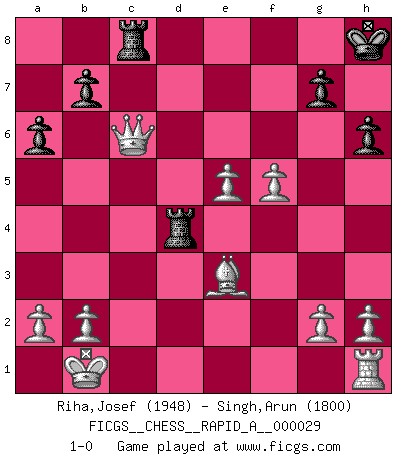 Last move : 1-0 2007 November 12 15:11:37 [Event "FICGS__CHESS__RAPID_A__000029"] [Site "FICGS"] [Date "2007.10.26"] [Round "1"] [White "Riha,Josef"] [Black "Singh,Arun"] [Result "1-0"] [WhiteElo "1948"] [BlackElo "1800"] 1.e4 e5 2.Nc3 Nc6 3.Nf3 Nf6 4.d4 exd4 5.Nxd4 Nxd4 6.Qxd4 d6 7.Bg5 Be7 8.O-O-O O-O 9.Bc4 h6 10.Bf4 Be6 11.f3 a6 12.Bxe6 fxe6 13.e5 Ne8 14.Kb1 d5 15.Be3 c5 16.Qg4 Kh7 17.Qxe6 Nc7 18.Qg4 d4 19.Qe4+ Kh8 20.Bc1 Rb8 21.Ne2 Ne6 22.c3 Qb6 23.cxd4 cxd4 24.Nxd4 Bc5 25.Nb3 Rfd8 26.f4 Rbc8 27.f5 Nd4 28.Nxc5 Qxc5 29.Be3 Qc6 30.Rxd4 Rxd4 31.Qxc6 1-0 Vienna game, Max Lange defense Queenside Castling by player White (move 8) Kingside Castling by player Black (move 8) Player White won this chess game. Follow this game move after move (download)I am still a victim of Chess. It has all the beauty of art and much more. It cannot be commercialized. Chess is much purer than art in its social position. (Marcel Duchamp) Ich hatte meine größten Erfolge, als ich 47 Jahre alt war. Kasparow war noch nicht mal 42 und hat das Schach schon im Stich gelassen. (Viktor Kortschnoi) Los asuntos humanos son como una partida de Ajedrez: solo aquellos que no lo toman seriamente, pueden ser llamados buenos jugadores. (Hung Tzu Ch'eng) Mon pion favori sur ma case favorite ! Bronstein en parlant d'un coup de pion en h5 quand il avait les Noirs. Art is the only way to run away without leaving home. (Twyla Tharp)