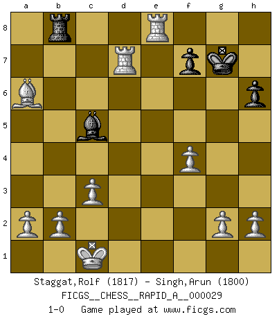 Last move : 1-0 2007 December 18 14:34:15 [Event "FICGS__CHESS__RAPID_A__000029"] [Site "FICGS"] [Date "2007.10.26"] [Round "1"] [White "Staggat,Rolf"] [Black "Singh,Arun"] [Result "1-0"] [WhiteElo "1817"] [BlackElo "1800"] 1.e4 e5 2.Nf3 Nc6 3.d4 exd4 4.Nxd4 Nxd4 5.Qxd4 d6 6.Nc3 Nf6 7.Bg5 Be7 8.O-O-O O-O 9.e5 dxe5 10.Qxe5 Qe8 11.Qxc7 Bd8 12.Qg3 a6 13.Bd3 Qc6 14.Rhe1 Bc7 15.Qh4 h6 16.Bxf6 Qxf6 17.Qxf6 gxf6 18.Nd5 Be5 19.f4 Bd4 20.Be4 Bc5 21.Nxf6+ Kg7 22.Nd7 Bxd7 23.Rxd7 Rab8 24.Bxb7 Bb4 25.c3 Bc5 26.Bxa6 Rfe8 27.Rxe8 1-0 Scotch game Queenside Castling by player White (move 8) Kingside Castling by player Black (move 8) Player White won this chess game. Follow this game move after move (download)What is the object of playing a gambit opening?... To acquire a reputation of being a dashing player at the cost of losing a game. (Siegbert Tarrasch) Über die Verhaftung Bobby Fischers: Warum es die Bush-Administration für nötig befindet einen 61 Jahre alten Mann zu hetzten, der für niemanden ausser sich selbste eine Gefahr darstellt ist ein Rätsel. (Nigel Short) Los Peones son nacidos libres, y aún así, se encuentran por doquier encadenados. (Rick Kennedy) La tactique est l'élément le plus important du milieu de jeu. (Siegbert Tarrasch) A bird doesn't sing because it has an answer, it sings because it has a song. (Maya Angelou)