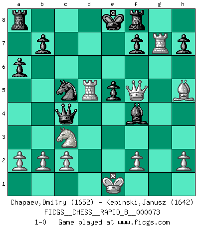 Last move : 1-0 2007 December 16 22:6:15 [Event "FICGS__CHESS__RAPID_B__000073"] [Site "FICGS"] [Date "2007.10.27"] [Round "1"] [White "Chapaev,Dmitry"] [Black "Kepinski,Janusz"] [Result "1-0"] [WhiteElo "1652"] [BlackElo "1642"] 1.e4 e6 2.d4 d5 3.Nc3 Nf6 4.Bg5 dxe4 5.Nxe4 Be7 6.Bxf6 gxf6 7.Nf3 f5 8.Nc3 Bf6 9.Qd2 c5 10.Bb5+ Bd7 11.dxc5 a6 12.Be2 Bc6 13.Qe3 Nd7 14.Nd4 Bxg2 15.Rg1 f4 16.Qxf4 e5 17.Qe3 Bg5 18.Qd3 Nxc5 19.Qf5 Bf4 20.Rxg2 Qxd4 21.Rd1 Qb4 22.Rg7 Rf8 23.Bh5 Qc4 24.Rd5 1-0 French : Burn variation Player White won this chess game. Follow this game move after move (download)Chess is not like life... it has rules ! (Mark Pasternak) Ohne ihre Erfolge schmälern zu wollen würde ich sagen Petrosian, Spassky und Karpov verdanken ihre Siege ihren Trainern - Boleslavsky, Bondarevsky und Furman. (Mikhail Moiseyevich Botvinik) El hombre es un frívolo, una creatura engañosa y como un jugador de Ajedrez, se preocupa mas por el proceso de obtener su meta que de la meta por sí misma. (Dostoyevsky) Des idées, des idées, j'en ai cent, j'en ai mille. Des bonnes, des mauvaises, applicables, irréalisables... Il suffit de faire le tri ! (Roos) For to win one hundred victories in one hundred battles is not the acme of skill. To subdue the enemy without fighting is the acme of skill. (Sun Tzu)