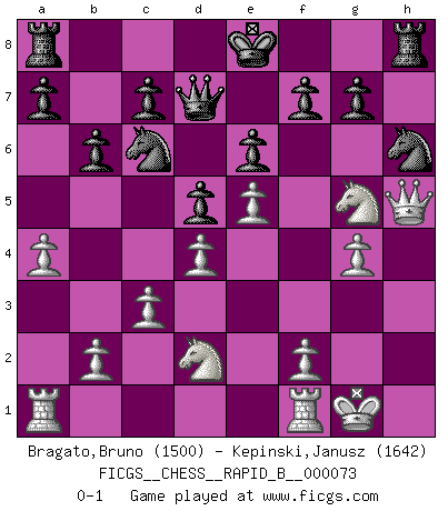 Last move : 0-1 2007 December 20 21:28:46 [Event "FICGS__CHESS__RAPID_B__000073"] [Site "FICGS"] [Date "2007.10.27"] [Round "1"] [White "Bragato,Bruno"] [Black "Kepinski,Janusz"] [Result "0-1"] [WhiteElo "1500"] [BlackElo "1642"] 1.e4 e6 2.d4 d5 3.e5 b6 4.c3 Qd7 5.a4 Ba6 6.Bxa6 Nxa6 7.Qd3 Nb8 8.Nf3 Ne7 9.O-O Ng6 10.h4 h5 11.Bg5 Be7 12.Nbd2 Bxg5 13.Nxg5 Nxh4 14.Qh3 Nf5 15.g4 Nh6 16.Qxh5 Nc6 0-1 This chess game has been lost on time (started : 2007.10.27 7:36:44) French : Advance variation Kingside Castling by player White (move 9) Player Black won this chess game. Follow this game move after move (download)Chess is a more highly symbolic game, but the aggressions are therefore even more frankly represented in the play. It probably began as a war game; that is, the representation of a miniature battle between the forces of two kingdoms. (Karl Meninger) Früher wurde jeder komplizierte Zug, jedes interessante Opfer mit großem Beifall und Enthusiasmus aufgenommen. Heute schaltet man einfach seinen Fritz an, und man kann sehen, was los ist, ob der Zug geht oder nicht. (Vladimir Kramnik) Personalmente, yo prefiero mirar hacia el futuro en donde un programa de computadora gane el título mundial de Ajedrez. La humanidad necesita una lección de humildad. (Richard Dawkings) C'est la seule position que je connaisse où les deux camps sont mals. Propos prêtés à V. Anand. He who laughs last probably does not get the joke. (Unknown)