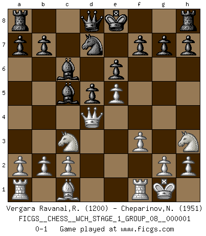Last move : 0-1 2006 August 10 20:51:30 [Event "FICGS__CHESS__WCH_STAGE_1_GROUP_08__000001"] [Site "FICGS"] [Date "2006.07.01"] [Round "1"] [White "Vergara Ravanal,Raul Andres"] [Black "Cheparinov,Nedelcho"] [Result "0-1"] [WhiteElo "1200"] [BlackElo "1951"] 1.d4 Nf6 2.Nc3 d5 3.f3 c5 4.e4 cxd4 5.Qxd4 Nc6 6.Bb5 Bd7 7.Bxc6 Bxc6 8.e5 Nd7 9.Nh3 e6 10.O-O Bc5 0-1 Queen's pawn game Kingside Castling by player White (move 10) Player Black won this chess game. Follow this game move after move (download)Even the laziest King flees wildly in the face of a double check ! (Aaron Nimzowitsch) Im Hotelzimmer gab es nur zwei Schaben. (Über die Turnierbedingungen) (Peter Swidler) Una de estas pequeñas movidas modestas pudieran ser mas molestas a tu oponente que la amenaza mas grande. (Siegbert Tarrasch) Les Echecs, c'est l'art de la guerre sans les charniers, c'est la résurrection des morts tombés au champ d'honneur, l'espoir perpétuel, la suprématie de l'intelligence sur la force, la culture de l'esprit. (F. Szpiner) The greatest con, that he ever pulled... was making you believe... that he is you. (Revolver, movie)