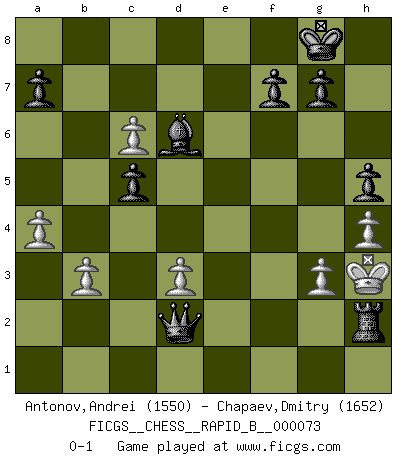 Last move : 0-1 2008 January 1 10:7:16 [Event "FICGS__CHESS__RAPID_B__000073"] [Site "FICGS"] [Date "2007.10.27"] [Round "1"] [White "Antonov,Andrei"] [Black "Chapaev,Dmitry"] [Result "0-1"] [WhiteElo "1550"] [BlackElo "1652"] 1.e4 c5 2.Bc4 e6 3.a4 Nc6 4.c3 d5 5.exd5 exd5 6.Bb5 Nf6 7.f3 Be7 8.Bxc6+ bxc6 9.d3 O-O 10.c4 Re8 11.Ne2 Bd6 12.b3 Ng4 13.fxg4 Qh4+ 14.Kf1 Qf6+ 15.Ke1 Qxa1 16.Qc2 Bxg4 17.g3 Rxe2+ 18.Qxe2 Bxe2 19.Kxe2 Qxb1 20.Rd1 Qc2+ 21.Ke1 Re8+ 22.Kf1 Qxd1+ 23.Kg2 Qxc1 24.h4 Qd2+ 25.Kh3 h5 26.cxd5 Re2 27.dxc6 Rh2+ 0-1 Sicilian defense Kingside Castling by player Black (move 9) Player Black won this chess game. Follow this game move after move (download)There must have been a time when men were demigods, or they could not have invented Chess. (Gustav Schenk) Spiel ein langweiliges Spiel zu Ende und lustige Dinge können passieren. (Hans Ree) El Ajedrez tiene tanto misterio como las mujeres. (Purdy) Même si vous avez un bon coup à faire, regardez toujours s'il n'y en a pas un qui lui soit préférable. (Pedro Damiano) The modern world has divided itself into Conservatives and Progressives. The business of Progressives is to go on making mistakes. The business of the Conservatives is to prevent the mistakes from being corrected. (G.K. Chesterton)