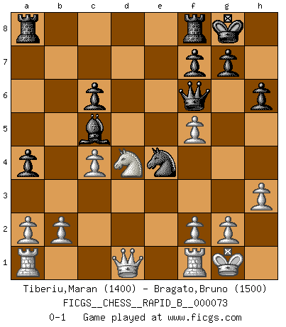 Last move : 0-1 2007 October 31 10:23:56 [Event "FICGS__CHESS__RAPID_B__000073"] [Site "FICGS"] [Date "2007.10.27"] [Round "1"] [White "Tiberiu,Maran"] [Black "Bragato,Bruno"] [Result "0-1"] [WhiteElo "1400"] [BlackElo "1500"] 1.e4 e5 2.Bc4 Nf6 3.d3 c6 4.Nf3 d5 5.Bb3 Bd6 6.Nc3 d4 7.Ne2 O-O 8.h3 Na6 9.O-O Nc5 10.Bg5 h6 11.Bxf6 Qxf6 12.Ng3 a5 13.c4 a4 14.Bc2 b5 15.Nf5 Bxf5 16.exf5 bxc4 17.dxc4 d3 18.Bxd3 e4 19.Bxe4 Nxe4 20.Nd4 Bc5 0-1 Bishop's Opening : Berlin defense Kingside Castling by player Black (move 7) Kingside Castling by player White (move 9) Player Black won this chess game. Follow this game move after move (download)Help your pieces so they can help you. (Paul Morphy) Je mehr ich von der FIDE weiss, um so weniger verstehe ich. (Alexander Kalifman) El Ajedrez es un mar en el cual un mosquito puede beber y un elefante puede bañarse. (Refrán Hindú) Le plus grand jeu de l'esprit jamais inventé, plus vous l'apprenez, plus vous y prenez du plaisir. (Garry Kasparov) If you ain't just a little scared when you enter a casino, you are either very rich or you haven't studied the games enough. (Pappy)
