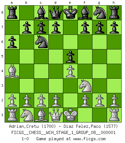 Last move : 1-0 2006 August 14 17:38:4 [Event "FICGS__CHESS__WCH_STAGE_1_GROUP_08__000001"] [Site "FICGS"] [Date "2006.07.01"] [Round "1"] [White "Adrian,Cretu"] [Black "Diaz Felez,Paco"] [Result "1-0"] [WhiteElo "1700"] [BlackElo "1577"] 1.e4 e5 2.Nf3 Nc6 3.Bb5 a6 4.Ba4 1-0 This chess game has been lost on time (started : 2006.07.01 16:10:15) Ruy Lopez Player White won this chess game. Follow this game move after move (download)Fischer was a master of clarity and a king of artful positioning. His opponents would see where he was going but were powerless to stop him. (Bruce Pandolfini) Bis jetzt ist Weiß einer wohlbekannten Analyse gefolgt. Aber jetzt begeht er einen schrecklichen Fehler: Er beginnt seinen eigenen Kopf zu benutzen. (Siegbert Tarrasch) Los errores estan ahí, esperando a que se cometan. (Savielly Tartakower) Votre prénom est 'Tactique', votre deuxième prénom est 'Tactique' et votre nom est 'Tactique'. (Ken Smith) The Internet is the first thing that humanity has build that humanity doesn't understand, the largest experiment in anarchy that we have ever had. (Eric Schmidt)