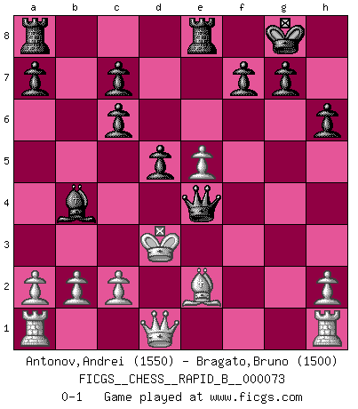 Last move : 0-1 2007 October 30 8:43:49 [Event "FICGS__CHESS__RAPID_B__000073"] [Site "FICGS"] [Date "2007.10.27"] [Round "1"] [White "Antonov,Andrei"] [Black "Bragato,Bruno"] [Result "0-1"] [WhiteElo "1550"] [BlackElo "1500"] 1.e4 e5 2.Nf3 Nf6 3.Nc3 Nc6 4.d4 exd4 5.Nxd4 Bb4 6.Nxc6 bxc6 7.f3 O-O 8.Bg5 h6 9.Bf4 d5 10.e5 Re8 11.Be2 Nh5 12.g3 Nxf4 13.gxf4 Qh4+ 14.Kd2 Qxf4+ 15.Kd3 Bf5+ 16.Ne4 Bxe4+ 17.fxe4 Qxe4+ 0-1 Petrov Three knights game Kingside Castling by player Black (move 7) Player Black won this chess game. Follow this game move after move (download)My God, Bobby Fischer plays so simply. (Alexei Suetin) Ich glaube, ich kenne inzwischen die Gründe für mein Versagen: schachliche Charakterfehler. Ich war nie ein Wunderkind und in meiner gesamten menschlichen Entwicklung immer zu langsam. (Viktor Kortschnoi) La última cosa en que Fischer estaba interesado era en tonterías, siempre y cuando el Ajedrez estuviera involucrado. (Elie Agur) Dieu déplace le joueur, et celui-ci la pièce. Quel Dieu derrière Dieu commence donc la trame ? Arturo Perez-Reverte (prix de littérature policière 1993). Life doesn't imitate art, it imitates bad television. (Woody Allen)