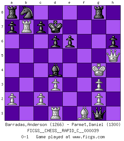 Last move : 0-1 2007 December 4 13:55:8 [Event "FICGS__CHESS__RAPID_C__000039"] [Site "FICGS"] [Date "2007.10.27"] [Round "1"] [White "Barradas,Anderson"] [Black "Parmet,Daniel"] [Result "0-1"] [WhiteElo "1266"] [BlackElo "1300"] 1.e4 e5 2.Nf3 Nf6 3.Nxe5 d6 4.Nf3 Nxe4 5.d3 Nf6 6.Bg5 Qe7+ 7.Be2 h6 8.Bh4 g5 9.Bg3 Bg7 10.O-O Nh5 11.Re1 Nxg3 12.hxg3 Bxb2 13.Bf1 Be6 14.Na3 Bxa3 15.Nd4 Bb2 16.Nxe6 fxe6 17.Qh5+ Kd7 18.Rab1 Qf6 19.Red1 Bd4 20.Rxb7 Qxf2+ 21.Kh2 Qg1+ 22.Kh3 g4+ 23.Kxg4 Rg8+ 0-1 Petrov : French attack Kingside Castling by player White (move 10) Player Black won this chess game. Follow this game move after move (download)I love all positions. Give me a difficult positional game, I will play it. But totally won positions, I cannot stand them. (Hein Donner) Es macht mich traurig, wenn ich sehe, dass Golfprofis mehr verdienen als Schachsportler. Obwohl ich davon überzeugt bin, dass wir Schachspieler viel härter trainieren müssen als die Golfer. (Alexandra Kosteniuk) El Ajedrez es el arte del análisis. (Mikhail Botvinnik) Ce qui est bien, c'est d'avoir tout un tas de pièces en prise : l'adversaire ne peut en prendre qu'une à la fois. Cité par Thierry Audin. Computers make it easier to do a lot of things, but most of the things they make it easier to do don't need to be done. (Andy Rooney)