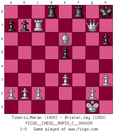 Last move : 1-0 2007 November 6 13:10:9 [Event "FICGS__CHESS__RAPID_C__000039"] [Site "FICGS"] [Date "2007.10.27"] [Round "1"] [White "Tiberiu,Maran"] [Black "Brieler,Jay"] [Result "1-0"] [WhiteElo "1400"] [BlackElo "1350"] 1.e4 e5 2.Bc4 Nf6 3.d3 Nc6 4.Nf3 Bc5 5.O-O d5 6.Bb3 dxe4 7.dxe4 Nxe4 8.Be3 Bxe3 9.fxe3 O-O 10.Qe2 Bg4 11.Nc3 h6 12.Nxe4 Qe7 13.h3 Bxf3 14.Rxf3 Rfd8 15.Rxf7 Qb4 16.Rxc7 Kh7 17.Qg4 Qf8 18.Ng5+ Kh8 19.Rf1 Qxf1+ 20.Kxf1 Rf8+ 21.Kg1 Nd8 22.Ne6 Nxe6 23.Bxe6 Rad8 24.Qxg7+ 1-0 Bishop's Opening : Berlin defense Kingside Castling by player White (move 5) Kingside Castling by player Black (move 9) Player White won this chess game. Follow this game move after move (download)There's never before been a Chess player with such a thorough knowledge of the intricacies of the game and such an absolutely indomitable will to win. I think Bobby is the greatest player that ever lived. (Lisa Lane) Im Fernschach kannst du während dem Spiel rauchen. (John Christen Knudsen) La partida mas dura de ganar es una partida ganada. (Emanuel Lasker) Il n'y a plus de joueurs du niveau de Jacob Murray dont la seule quête est le beau jeu, le plaisir de voir les pièces construire quelque chose. Sur 10 idées à la minute, 9 seront sans intérêt, la dernière s'avèrera géniale. (Christian Bauer) There are more things in heaven and earth than practically anywhere else. (Unknown)