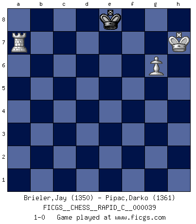 Last move : 1-0 2008 January 22 8:8:24 [Event "FICGS__CHESS__RAPID_C__000039"] [Site "FICGS"] [Date "2007.10.27"] [Round "1"] [White "Brieler,Jay"] [Black "Pipac,Darko"] [Result "1-0"] [WhiteElo "1350"] [BlackElo "1361"] 1.e4 e5 2.Nf3 Nc6 3.d4 exd4 4.Nxd4 Nxd4 5.Qxd4 Nf6 6.Nc3 b6 7.e5 Bc5 8.Qh4 Bd4 9.Qxd4 c5 10.Qc4 d5 11.Qb5+ Bd7 12.Qe2 Ng4 13.Nxd5 O-O 14.Bd2 Re8 15.Bc3 b5 16.a3 a5 17.Qe4 f6 18.Bd3 f5 19.Qf3 Be6 20.Nf4 b4 21.Nxe6 Nxe5 22.Qxf5 Nxd3+ 23.cxd3 bxc3 24.Qe5 Qd7 25.O-O Qxe6 26.Qxc3 Rac8 27.Rac1 Qd5 28.Qxa5 Qxd3 29.Rxc5 Rxc5 30.Qxc5 Qe2 31.Qd5+ Kf8 32.Qf5+ Kg8 33.h4 Qxb2 34.Qd7 Qe5 35.g3 Rf8 36.a4 Qa5 37.Rc1 Qb6 38.Qd5+ Kh8 39.Qc5 Qxc5 40.Rxc5 Ra8 41.a5 Kg8 42.f4 Kf7 43.Kf2 Ke6 44.Ke3 Ra6 45.Ke4 h6 46.g4 g6 47.Re5+ Kf6 48.g5+ hxg5 49.hxg5+ Kf7 50.f5 Kg7 51.f6+ Kf8 52.Re7 Rxa5 53.Kf4 Rf5+ 54.Kg4 Rc5 55.Rg7 Rc6 56.Rxg6 Kf7 57.Rg7+ Kf8 58.Kh5 Rc4 59.Kg6 Rd4 60.f7 Rd6+ 61.Kh7 Rd7 62.g6 Rxf7 63.Rxf7+ Ke8 64.Ra7 1-0 Scotch game Kingside Castling by player Black (move 13) Kingside Castling by player White (move 25) 10 pieces endgame at move 40 : White KRPPPP , Black KRPP WHITE : King + 1 Rook 4 Pawns BLACK : King + 1 Rook 2 Pawns 9 pieces endgame at move 48 : White KRPPP , Black KRPP WHITE : King + 1 Rook 3 Pawns BLACK : King + 1 Rook 2 Pawns 8 pieces endgame at move 49 : White KRPPP , Black KRP WHITE : King + 1 Rook 3 Pawns BLACK : King + 1 Rook 1 Pawn 7 pieces endgame at move 52 : White KRPP , Black KRP WHITE : King + 1 Rook 2 Pawns BLACK : King + 1 Rook 1 Pawn 6 pieces endgame at move 56 : White KRPP , Black KR WHITE : King + 1 Rook 2 Pawns BLACK : King + 1 Rook 5 pieces endgame at move 62 : White KRP , Black KR WHITE : King + 1 Rook 1 Pawn BLACK : King + 1 Rook 4 pieces endgame at move 63 : White KRP , Black K WHITE : King + 1 Rook 1 Pawn BLACK : King + Player White won this chess game. Follow this game move after move (download)Is Bobby Fischer quite sane ? (Salo Flohr) Stil? Ich habe keinen Stil! (Anatoly Karpov) Buenas posiciones no logran ganar juegos, buenas movidas sí. (Gerald Abrahams) La victoire dans une partie d'Echecs appartient la plupart du temps à celui qui voit un peu plus loin que l'adversaire. (Lasker) Go and wake up your luck. (Persian saying)