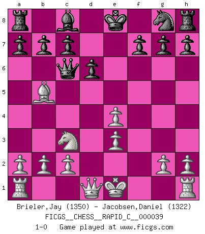 Last move : 1-0 2007 October 31 11:41:41 [Event "FICGS__CHESS__RAPID_C__000039"] [Site "FICGS"] [Date "2007.10.27"] [Round "1"] [White "Brieler,Jay"] [Black "Jacobsen,Daniel"] [Result "1-0"] [WhiteElo "1350"] [BlackElo "1322"] 1.e4 e5 2.Nf3 Nc6 3.d4 exd4 4.Nxd4 Bc5 5.Nxc6 Qf6 6.Be3 Bxe3 7.fxe3 Qxc6 8.Nc3 d6 9.Bb5 1-0 Scotch game Player White won this chess game. Follow this game move after move (download)If your opponent offers you a draw, try to work out why he thinks he's worse off. (Nigel Short) Um sich vor der Gefahr einer Erkältung zu schützen, sorge der wanderlustige König beizeiten für ein brauchbares Versteck. (Aaron Nimzowitsch) El Ajedrez no es una pizca de inferior al violín, y tenemos un gran número de violinistas profesionales. (Mikhail Botvinnik) Aucun coup ne doit être joué sans but. (Pedro Damiano) A cynic is a man who knows the price of everything but the value of nothing. (Oscar Wilde)