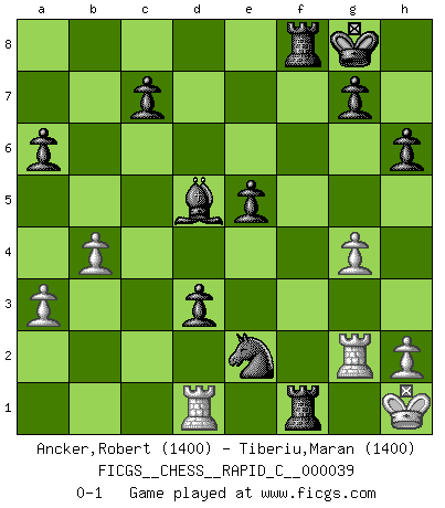 Last move : 0-1 2007 November 25 3:34:3 [Event "FICGS__CHESS__RAPID_C__000039"] [Site "FICGS"] [Date "2007.10.27"] [Round "1"] [White "Ancker,Robert"] [Black "Tiberiu,Maran"] [Result "0-1"] [WhiteElo "1400"] [BlackElo "1400"] 1.e4 e5 2.Bc4 d6 3.Bxf7+ Kxf7 4.d3 Nf6 5.Bg5 Be7 6.Nf3 h6 7.O-O Bg4 8.Bh4 Nc6 9.c3 Rf8 10.Qb3+ Be6 11.Qd1 Kg8 12.Nbd2 a6 13.Qe2 d5 14.Bxf6 Bxf6 15.b4 Ne7 16.exd5 Qxd5 17.c4 Qd7 18.Ne4 Nc6 19.Nxf6+ Rxf6 20.Rad1 Re8 21.Nh4 Qd4 22.Qe3 Qxh4 23.Qg3 Qd4 24.Rde1 Rf5 25.a3 Ref8 26.Qe3 b5 27.Qxd4 Nxd4 28.f3 bxc4 29.Rf2 cxd3 30.g4 Rxf3 31.Rg2 Bd5 32.Rd1 Ne2+ 33.Kh1 Rf1+ 0-1 Bishop's Opening Kingside Castling by player White (move 7) Player Black won this chess game. Follow this game move after move (download)Chess is a part of culture and if a culture is declining then Chess too will decline. (Mikhail Botvinnik) Wenn ein Kopf und ein Buch zusammenstoßen und es klingt hohl, ist es denn allemal im Buche? (Georg Christoph Lichtenberg) El Ajedrez es el arte del análisis. (Mikhail Botvinnik) Pour se monter efficace, un Cavalier a besoin d'avant-postes ! Les Cavaliers font les meilleurs bloqueurs de pions passés. Employ the attack like tactic of defense. (Chinese proverb)