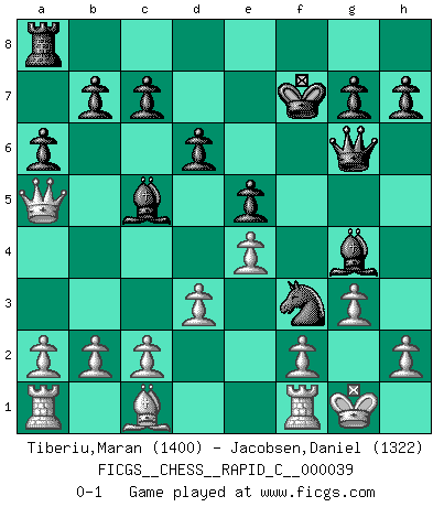 Last move : 0-1 2007 October 31 10:34:10 [Event "FICGS__CHESS__RAPID_C__000039"] [Site "FICGS"] [Date "2007.10.27"] [Round "1"] [White "Tiberiu,Maran"] [Black "Jacobsen,Daniel"] [Result "0-1"] [WhiteElo "1400"] [BlackElo "1322"] 1.e4 e5 2.Nf3 Nc6 3.Bc4 Nf6 4.d3 Bc5 5.Nc3 a6 6.Ng5 O-O 7.Nxf7 Rxf7 8.Bxf7+ Kxf7 9.Nd5 d6 10.Nxf6 Qxf6 11.O-O Qg6 12.g3 Bg4 13.Qd2 Nd4 14.Qa5 Nf3+ 0-1 Two knights defense (Modern Bishop's Opening) Kingside Castling by player Black (move 6) Kingside Castling by player White (move 11) Player Black won this chess game. Follow this game move after move (download)What is the difference between chess and football? Everybody understands football, but nobody plays it. Everybody plays chess, but nobody understands it. Everything is relative. (Vladimir Kramnik) Der Vorposten provoziert a) eine Basis für neue Angriffe und b) eine Schwächung der gegnerischen Widerstandskraft in der fraglichen Linie. (Aaron Nimzowitsch) Yo jugué Ajedrez con el y a veces le pude haber ganado solo que siempre devuelve su última jugada y juega la partida de manera diferente. (Mark Twain) Avant la finale, les dieux ont créé le milieu de partie. (Tarrasch) Real knowledge is to know the extent of one's ignorance. (Confucius)