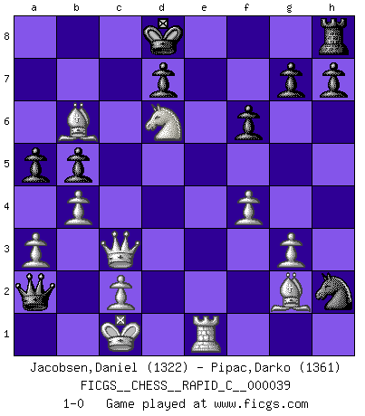 Last move : 1-0 2007 December 3 19:42:46 [Event "FICGS__CHESS__RAPID_C__000039"] [Site "FICGS"] [Date "2007.10.27"] [Round "1"] [White "Jacobsen,Daniel"] [Black "Pipac,Darko"] [Result "1-0"] [WhiteElo "1322"] [BlackElo "1361"] 1.e4 e5 2.Nf3 Nc6 3.d4 Nf6 4.d5 Nd4 5.Nxd4 exd4 6.Qxd4 Qe7 7.Nc3 Qc5 8.Be3 Qb4 9.O-O-O b6 10.Qe5+ Be7 11.a3 Qd6 12.Qd4 c5 13.Qa4 a6 14.Nb5 Qb8 15.Nc3 b5 16.Qb3 c4 17.Qa2 Qe5 18.f4 Qh5 19.d6 Ng4 20.Rd5 Qh4 21.g3 Qf6 22.Bc5 Bb7 23.Rf5 Qe6 24.dxe7 Bxe4 25.Re5 Nxe5 26.Nxe4 Ng4 27.Bg2 Rc8 28.Nd6+ Kxe7 29.Nxc8+ Kd8 30.Nd6 Nxh2 31.b4 a5 32.Qb2 c3 33.Qxc3 f6 34.Re1 Qa2 35.Bb6+ 1-0 Scotch Opening Queenside Castling by player White (move 9) Player White won this chess game. Follow this game move after move (download)The enormous mental resilience, without which no Chess player can exist, was so much taken up by Chess that he could never free his mind of this game. (Albert Einstein) Ich verlor meine Bürgerrechte, mein Gehalt wurde mir nicht mehr bezahlt und ich wurde zensiert und durfte nicht mehr ins Ausland reisen. [nach dem Match Fischer-Taimanov 6:0] (Mark Taimanov) El Ajedrez es un juego terrible. Si no dominas el centro, tu oponente tiene una posición mas libre. Si tu tienes el centro, entonces realmente tienes algo de que preocuparte. (Siegbert Tarrasch) Celui qui prend des risques peut perdre, celui qui n'en prend pas perd toujours. (Xavier Tartacover) If you are going through hell, keep going. (Winston Churchill)