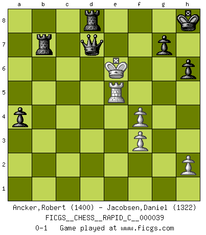 Last move : 0-1 2007 December 10 3:3:20 [Event "FICGS__CHESS__RAPID_C__000039"] [Site "FICGS"] [Date "2007.10.27"] [Round "1"] [White "Ancker,Robert"] [Black "Jacobsen,Daniel"] [Result "0-1"] [WhiteElo "1400"] [BlackElo "1322"] 1.e4 e5 2.Bc4 Nf6 3.Bxf7+ Kxf7 4.d3 Be7 5.Bg5 Rf8 6.Nf3 h6 7.Nxe5+ Kg8 8.Bh4 Qe8 9.O-O d6 10.Nf3 Nc6 11.c3 Ng4 12.Bg3 Nce5 13.Nbd2 Nxd3 14.Qb3+ Kh8 15.Nc4 Be6 16.Ne1 Nxe1 17.Raxe1 b5 18.Nxd6 Bxb3 19.Nxe8 Raxe8 20.axb3 Bd6 21.e5 Nxe5 22.Re2 Nf3+ 23.gxf3 Rxe2 24.Bxd6 cxd6 25.Kg2 Rfe8 26.c4 Rxb2 27.cxb5 Rxb3 28.Rd1 Rd8 29.Rd5 Ra3 30.Rd4 Rb3 31.f4 Rxb5 32.Kg3 a5 33.Kg4 Rb4 34.Rd5 a4 35.Ra5 d5 36.f3 d4 37.Kf5 d3 38.Ke6 d2 39.Ke7 d1Q 40.Re5 Rb7+ 41.Ke6 Qd7+ 0-1 Bishop's Opening : Berlin defense Kingside Castling by player White (move 9) Promotion Queen by player Black (move 39) Player Black won this chess game. Follow this game move after move (download)It is the aim of the modern school, not to treat every position according to one general law, but according to the principle inherent in the position. (Richard Reti) Im Leben werden Partien nie so unstrittig gewonnen wie im Spiel (Emanuel Lasker) Cuando no sepas que mover, espera por una idea que se le venga a la la cabeza de tu oponente. Tenlo por seguro de que esa idea estará incorrecta. (Siegbert Tarrasch) Le système Elo représente seulement une moyenne. Il est simplement un indicateur de votre stabilité. (Anatoli Karpov) Philosophers use a language that is already deformed as though by shoes that are too tight. (Ludwig Wittgenstein)