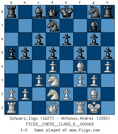 Last move : 1-0 2008 March 26 5:5:45 [Event "FICGS__CHESS__CLASS_D__000065"] [Site "FICGS"] [Date "2007.10.28"] [Round "1"] [White "Schwarz,Ingo"] [Black "Antonov,Andrei"] [Result "1-0"] [WhiteElo "1627"] [BlackElo "1550"] 1.g3 g6 2.Bg2 Bg7 3.f3 c6 4.Nh3 d6 5.Nf2 f5 6.d4 d5 7.c3 a5 8.O-O h5 9.h4 e6 10.Bf4 Nd7 11.Nd3 b5 12.Nd2 1-0 Benko's Opening Kingside Castling by player White (move 8) Player White won this chess game. Follow this game move after move (download)I guess a certain amount of temperament is expected of Chess geniuses. (Ron Gross) Mit sehr nachdenklichem Gesicht schreitet Bobby durch den Turniersaal. Was ist passiert?, fragt Lombardy. Ich stehe schlecht, antwortet Fischer. Lombardy: Dann biete doch einfach Remis an. Fischer: So schlecht stehe ich nun auch wieder nicht! (Robert James Fischer) No volvere nunca a jugar contigo. Has insultado a mi amigo. - cuando un oponente se maldijo por una mala jugada (Miguel Najdorf) Je menace de comprendre la position. (Anonyme) In every real man a child is hidden that wants to play. (Friedrich Nietzsche)