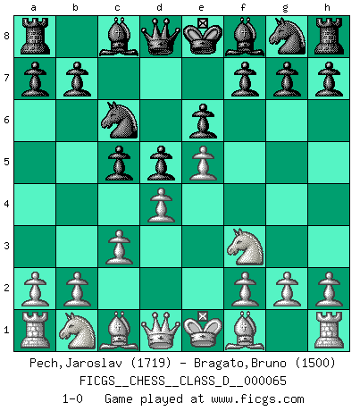Last move : 1-0 2007 December 20 21:28:46 [Event "FICGS__CHESS__CLASS_D__000065"] [Site "FICGS"] [Date "2007.10.28"] [Round "1"] [White "Pech,Jaroslav"] [Black "Bragato,Bruno"] [Result "1-0"] [WhiteElo "1719"] [BlackElo "1500"] 1.e4 e6 2.d4 d5 3.e5 c5 4.c3 Nc6 5.Nf3 1-0 This chess game has been lost on time (started : 2007.10.28 13:46:54) French : Advance, Paulsen attack Player White won this chess game. Follow this game move after move (download)Blessed be the memory of him who gave the world this immortal game. (A. G. Gardiner) Wenn man heute mit 14 Jahren noch kein GM ist, kann man es vergessen. (Viswanathan Anand) No es tiempo de jugar al Ajedrez cuando la casa esta en llamas. (Proverbio Italiano) RxDa4 pat (...) The problem with manipulation is that people can turn on you. (Horatio Caine, C.S.I. Miami)
