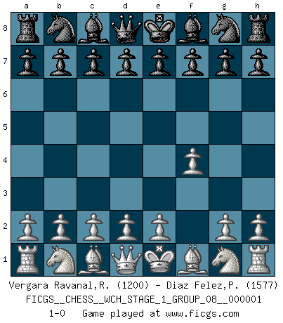 Last move : 1-0 2006 September 1 7:9:33 [Event "FICGS__CHESS__WCH_STAGE_1_GROUP_08__000001"] [Site "FICGS"] [Date "2006.07.01"] [Round "1"] [White "Vergara Ravanal,Raul Andres"] [Black "Diaz Felez,Paco"] [Result "1-0"] [WhiteElo "1200"] [BlackElo "1577"] 1.f4 1-0 This chess game has been lost on time (started : 2006.07.01 16:10:15) Bird's Opening Player White won this chess game. Follow this game move after move (download)Not all artists are Chess players, but all Chess players are artists. (Marcel Duchamp) Alles was ich jemals tun will ist Schach spielen. (Robert James Fischer) Te sientas frente a un tablero y repentinamente tu corazón brinca. Tu mano tiembla al tomar una pieza y moverla. Pero lo que el Ajedrez te enseña es que tu debes permanecer ahí con calma y pensar de que si realmente es una buena idea o de que si hay otras ideas mejores. (Stanley Kubrick) J'ai vu le vaincu d'Echecs jouer des années durant dans l'espoir de la fête de la victoire. Car tu es plus riche de ce qu'elle existe si même elle n'est point pour toi. Ainsi de la perle du fond des mers. (Antoine de Saint-Exupéry) All maxims have their antagonist maxims; proverbs should be sold in pairs, a single one being but a half truth. (William Mathews)