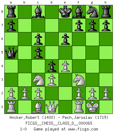 Last move : 1-0 2007 December 24 21:48:35 [Event "FICGS__CHESS__CLASS_D__000065"] [Site "FICGS"] [Date "2007.10.28"] [Round "1"] [White "Ancker,Robert"] [Black "Pech,Jaroslav"] [Result "1-0"] [WhiteElo "1400"] [BlackElo "1719"] 1.e4 c5 2.Bc4 e6 3.Nf3 Nc6 4.d3 d5 5.Bb5 Qa5+ 6.Nc3 d4 7.Bxc6+ bxc6 8.O-O 1-0 This chess game has been lost on time (started : 2007.10.28 13:46:54) Sicilian defense Kingside Castling by player White (move 8) Player White won this chess game. Follow this game move after move (download)What is the object of playing a gambit opening?... To acquire a reputation of being a dashing player at the cost of losing a game. (Siegbert Tarrasch) Immer nach dem besten Zug zu suchen ist ziemlich unpraktisch. (Nigel Short) Si yo gano un torneo, yo lo gano por mí mismo. Yo hago las jugadas. Nadie me ayuda. (Bobby Fischer) Le profane ne songe pas à la somme de jouissance dont il se prive, qui méconnaît ce jeu aux ressources aussi variées que passionnantes. (Jean-Marie Jeanton-Lamarche) If you don't practice you don't deserve to win. (Andre Agassi)