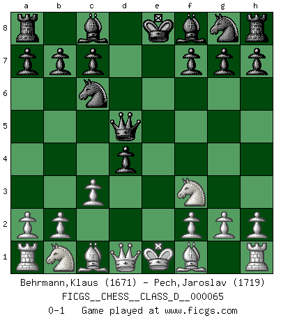 Last move : 0-1 2008 January 13 23:10:30 [Event "FICGS__CHESS__CLASS_D__000065"] [Site "FICGS"] [Date "2007.10.28"] [Round "1"] [White "Behrmann,Klaus"] [Black "Pech,Jaroslav"] [Result "0-1"] [WhiteElo "1671"] [BlackElo "1719"] 1.e4 e5 2.Nf3 Nc6 3.d4 exd4 4.c3 d5 5.exd5 Qxd5 0-1 This chess game has been lost on time (started : 2007.10.28 13:46:54) Scotch : Goering gambit Player Black won this chess game. Follow this game move after move (download)Becoming successful at Chess allows you to discover your own personality. That's what I want for the kids I teach. (Saudin Robovic) Die größte Kunst beim Schach besteht darin dem Gegner nicht zu zeigen was er tun kann. (Garry Kasparov) No hay un Gran Maestro de Ajedrez que sea normal; solo se diferencían ellos por la magnitud de su locura. (Viktor Korchnoi) Dans le domaine de la peinture, de la gravure et de la sculpture, dès la première décennie de notre siècle, les artistes abandonnent la représentation de la partie d'échecs pour se concentrer sur les pièces, sur les échiquiers et sur toutes les variations auxquelles les unes et les autres peuvent donner lieu. On passe en quelque sorte d'un thème social à un thème musical (au sens de la musica médiévale, c'est-à-dire d'une notion qui inclue le rythme, l'harmonie, la construction et la déconstruction, etc.). Graphiquement et picturalement, l'échiquier apparaît comme une structure ouverte, dynamique, d'une richesse infinie, autorisant toutes les combinatoires et débouchant sur des mouvements et des rythmes de nature exponentielle. (Michel Pastoureau) There are 10 types of people in this world: those who understand binary and those who don't. (Anonymous)