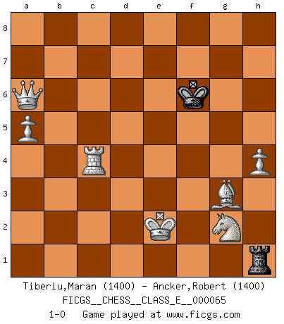 Last move : 1-0 2008 January 14 5:0:50 [Event "FICGS__CHESS__CLASS_E__000065"] [Site "FICGS"] [Date "2007.10.28"] [Round "1"] [White "Tiberiu,Maran"] [Black "Ancker,Robert"] [Result "1-0"] [WhiteElo "1400"] [BlackElo "1400"] 1.e4 e5 2.Nf3 Bc5 3.d4 exd4 4.Nxd4 Nf6 5.Be3 Nxe4 6.Bd3 d5 7.Bxe4 O-O 8.Bf3 Qe7 9.O-O c6 10.Re1 Bb4 11.c3 Bd6 12.Qd2 c5 13.Nb5 Na6 14.Qxd5 Nc7 15.Nxc7 Qxc7 16.g3 Be6 17.Qd1 Rab8 18.Na3 a6 19.Qd3 b5 20.Rad1 c4 21.Qd4 Qd7 22.Qxd6 Qxd6 23.Rxd6 Bh3 24.Bc5 Rfd8 25.Rxd8+ Rxd8 26.Bg2 Bxg2 27.Kxg2 h6 28.Nc2 Rd2 29.Rc1 Rd5 30.Bb4 Rd2 31.b3 f5 32.a4 Kf7 33.bxc4 bxc4 34.a5 g5 35.Nd4 f4 36.Nf5 fxg3 37.Nd6+ Kg6 38.Nxc4 Re2 39.hxg3 g4 40.Nd6 h5 41.c4 h4 42.gxh4 Kh5 43.Nf5 Re4 44.f3 gxf3+ 45.Kxf3 Rg4 46.Be1 Rg1 47.c5 Kg6 48.Ne3 Rh1 49.Ng2 Kf5 50.c6 Rf1+ 51.Ke2 Rh1 52.c7 Ke5 53.c8Q Ke4 54.Rc4+ Ke5 55.Bg3+ Kf6 56.Qxa6+ 1-0 King's knight Opening Kingside Castling by player Black (move 7) Kingside Castling by player White (move 9) 10 pieces endgame at move 45 : White KRBNPPP , Black KRP WHITE : King + 1 Rook 1 Bishop 1 Knight 3 Pawns BLACK : King + 1 Rook 1 Pawn Promotion Queen by player White (move 53) 9 pieces endgame at move 56 : White KQRBNPP , Black KR WHITE : King + 1 Queen 1 Rook 1 Bishop 1 Knight 2 Pawns BLACK : King + 1 Rook Player White won this chess game. Follow this game move after move (download)Chess is as much a mystery as women. (Purdy) Ein guter Spieler hat immer Glück. (José Raúl Capablanca) La táctica fluye a partir de una posición superior. (Bobby Fischer) À la honte des hommes, on sait que les lois du jeu sont les seules qui soient partout justes, claires, inviolables et exécutées. Pourquoi l'Indien qui a donné les règles du jeu d'échecs est-il obéi de bon gré dans toute la terre, et que les décrétales des papes, par exemple, sont aujourd'hui un objet d'horreur et de mépris ? C'est que l'inventeur des échecs combina tout avec justesse pour la satisfaction des joueurs, et que les papes, dans leurs décrétales, n'eurent en vue que leur seul avantage. L'Indien voulut exercer également l'esprit des hommes et leur donner du plaisir; les papes ont voulu abrutir l'esprit des hommes. Voltaire (Dictionnaire philosophique / Garnier 1967) Panic is a sudden desertion of us, an a going over to the enemy of our imagination. (Christian Nevell Bovee)
